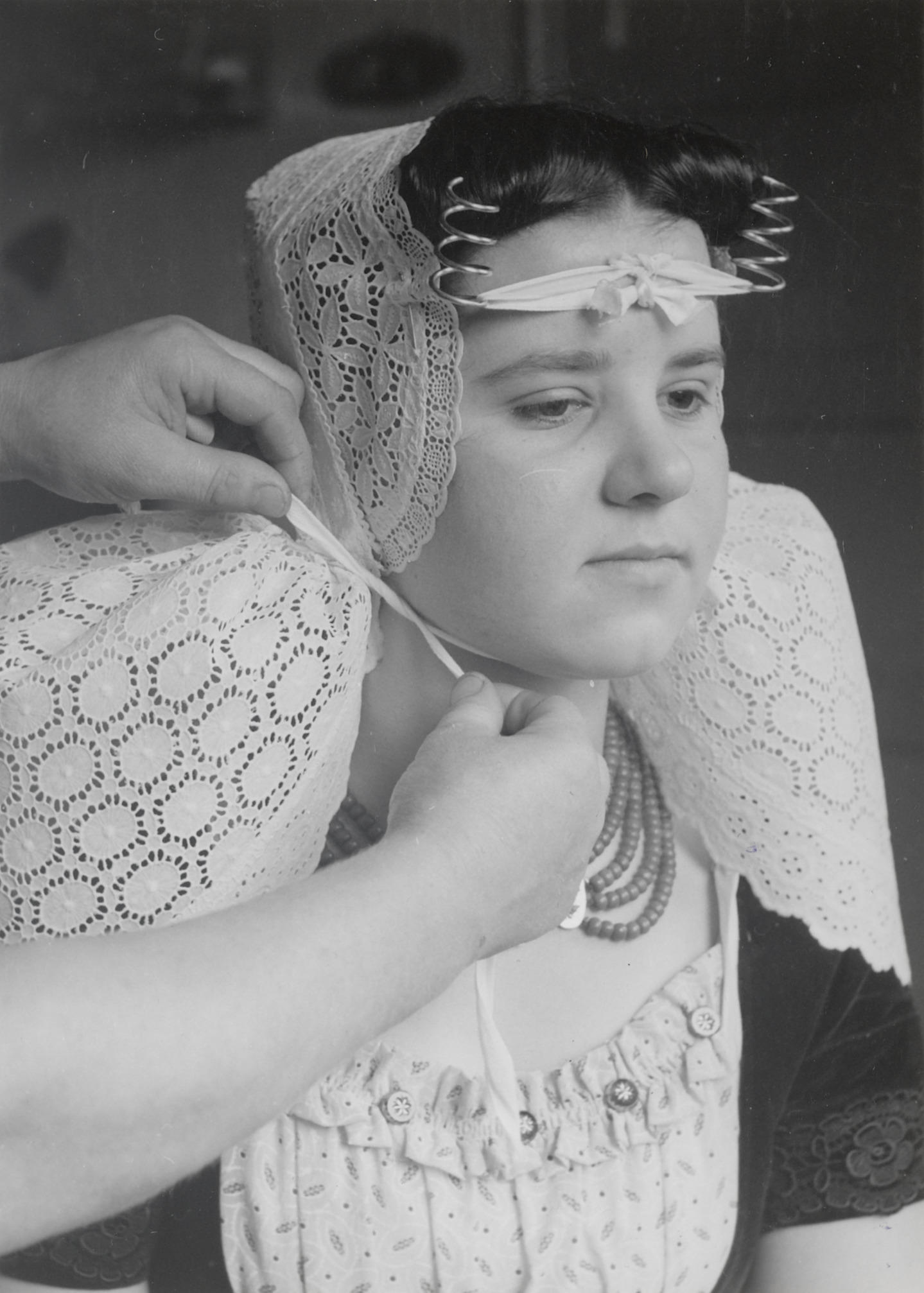 Kornelia Minderhoud uit Westkapelle demonstreert samen met haar moeder Willemina Minderhoud-Boogaard het 'kapzetten' van de Walcherse meisjesmuts, de zogenoemde lange muts. Het meeste haar is naar voren gekamd, in het midden gescheiden en tot twee stevige rollen gedraaid. Vervolgens is de ondermuts van witte broderie met het daarin vastgespelde oorijzer opgezet. De ondermuts is aan ...