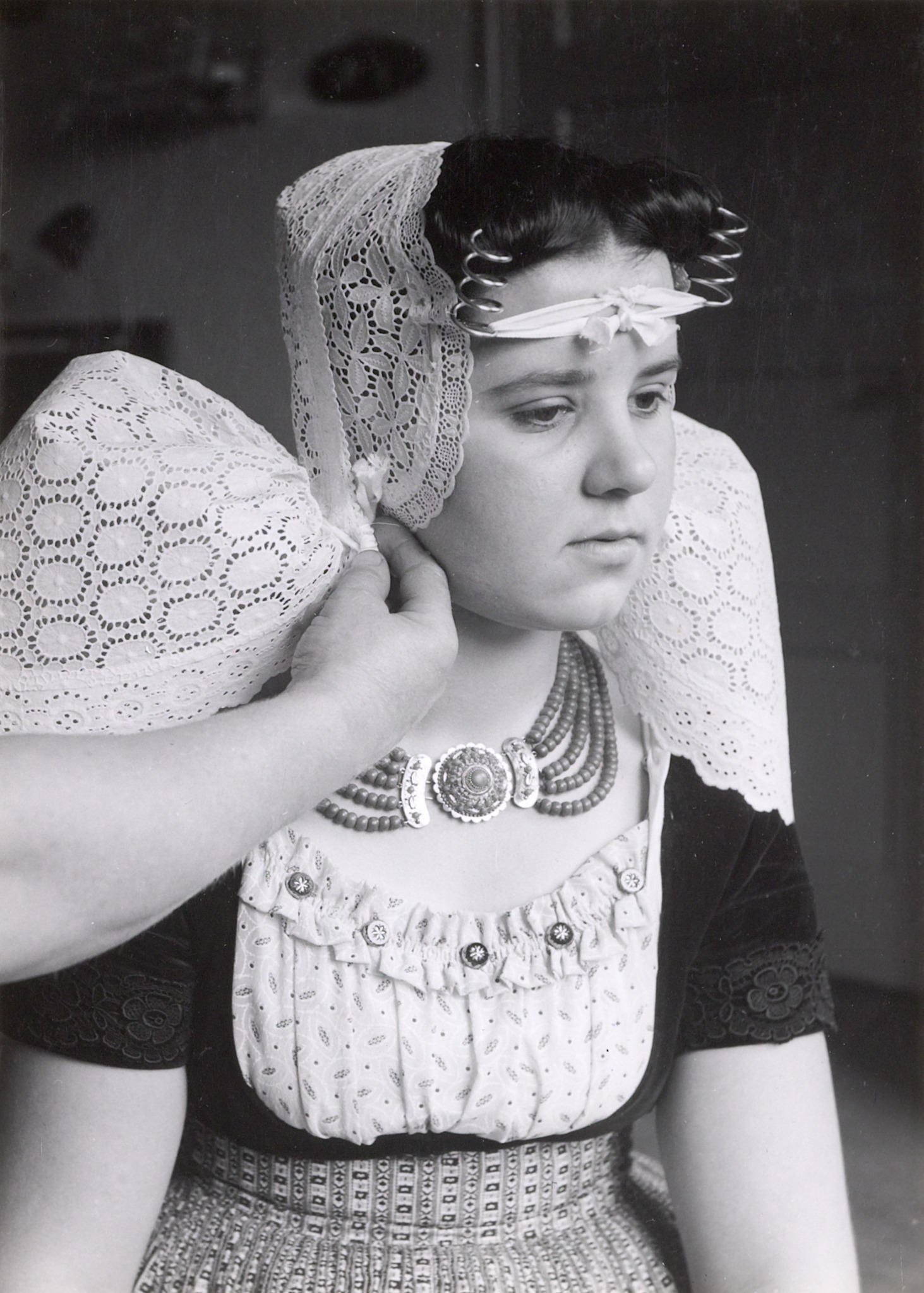 Kornelia Minderhoud uit Westkapelle demonstreert samen met haar moeder Willemina Minderhoud-Boogaard het 'kapzetten' van de Walcherse meisjesmuts, de zogenoemde lange muts. Het meeste haar is naar voren gekamd, in het midden gescheiden en tot twee stevige rollen gedraaid. Vervolgens is de ondermuts van witte broderie met het daarin vastgespelde oorijzer opgezet. De ondermuts is aan ...