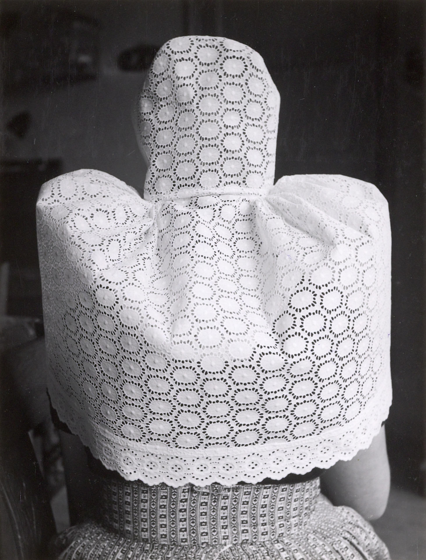 Kornelia Minderhoud uit Westkapelle demonstreert samen met haar moeder Willemina Minderhoud-Boogaard het 'kapzetten' van de Walcherse meisjesmuts, de zogenoemde lange muts. Het meeste haar is naar voren gekamd, in het midden gescheiden en tot twee stevige rollen gedraaid. Vervolgens is de ondermuts van witte broderie met het daarin vastgespelde oorijzer opgezet. De ondermuts is aan ...