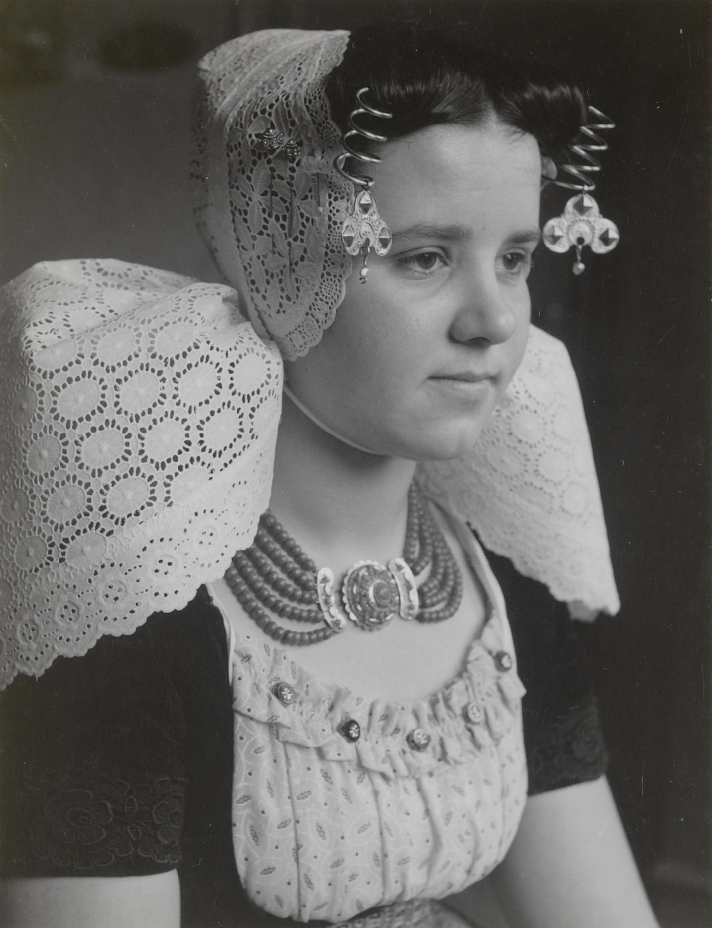 Kornelia Minderhoud uit Westkapelle demonstreert samen met haar moeder Willemina Minderhoud-Boogaard het 'kapzetten' van de Walcherse meisjesmuts, de zogenoemde lange muts. Het meeste haar is naar voren gekamd, in het midden gescheiden en tot twee stevige rollen gedraaid. Vervolgens is de ondermuts van witte broderie met het daarin vastgespelde oorijzer opgezet. De ondermuts is aan ...