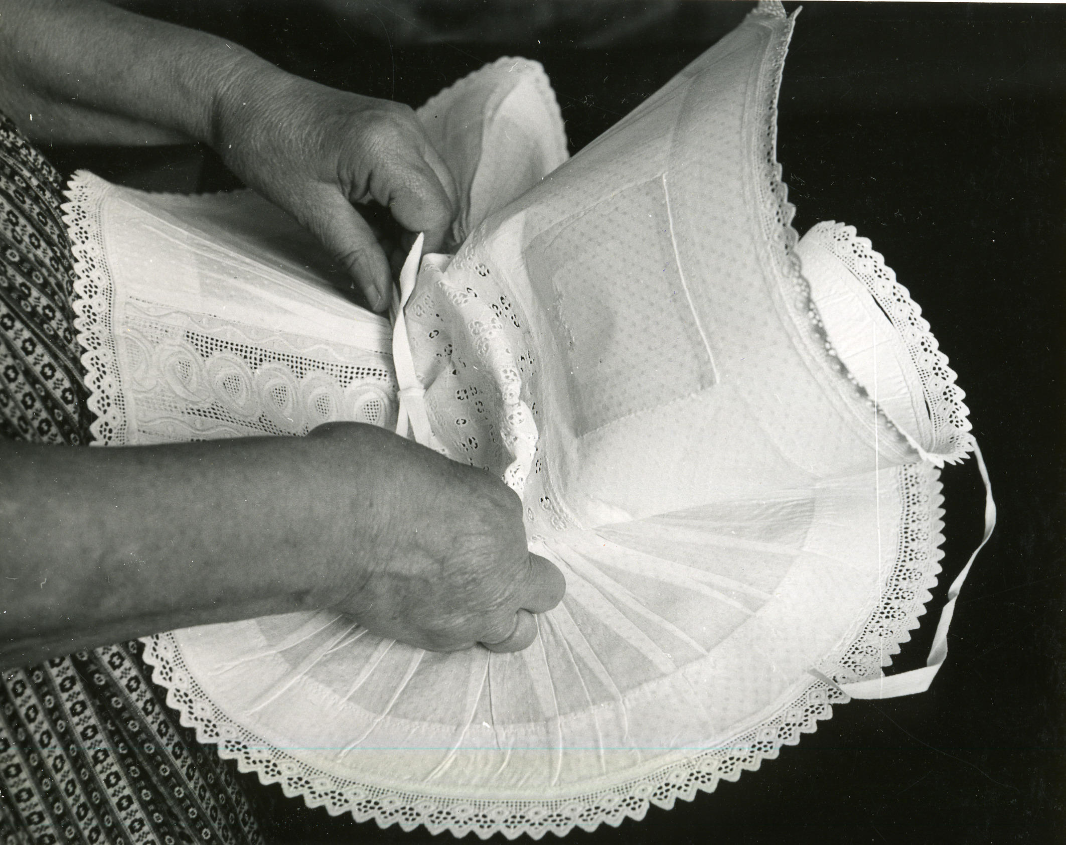 Mevrouw Theune-de Keuning uit Middelburg, gekleed in de streekdracht van Nieuw- en Sint Joosland, demonstreert het 'kapzetten'. Het broderiekantje langs de voorzijde van de gesteven bovenmuts is van binnen naar buiten omgevouwen. Middenachter worden de trekbanden aangetrokken, geknoopt en gestrikt. Dit is de katoenen bovenmuts die gedragen wordt bij de opknapdracht. Boven op de voorzijde, ...