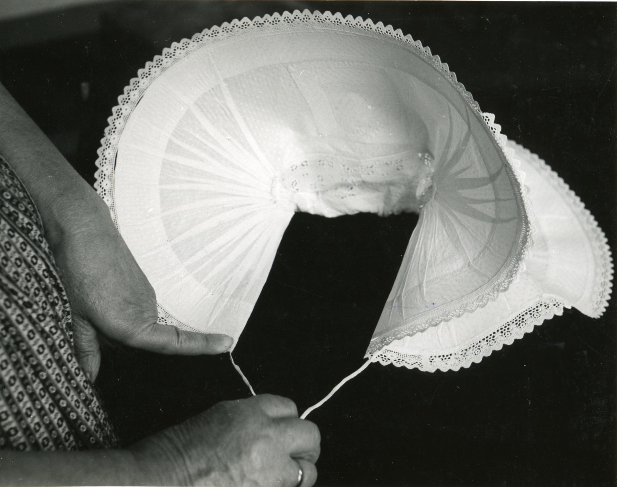 Mevrouw Theune-de Keuning uit Middelburg, gekleed in de streekdracht van Nieuw- en Sint Joosland, demonstreert het 'kapzetten'. De beide keelbanden liggen tussen het voor- en achtergedeelte van de muts. Dit is de katoenen bovenmuts die gedragen wordt bij de opknapdracht.