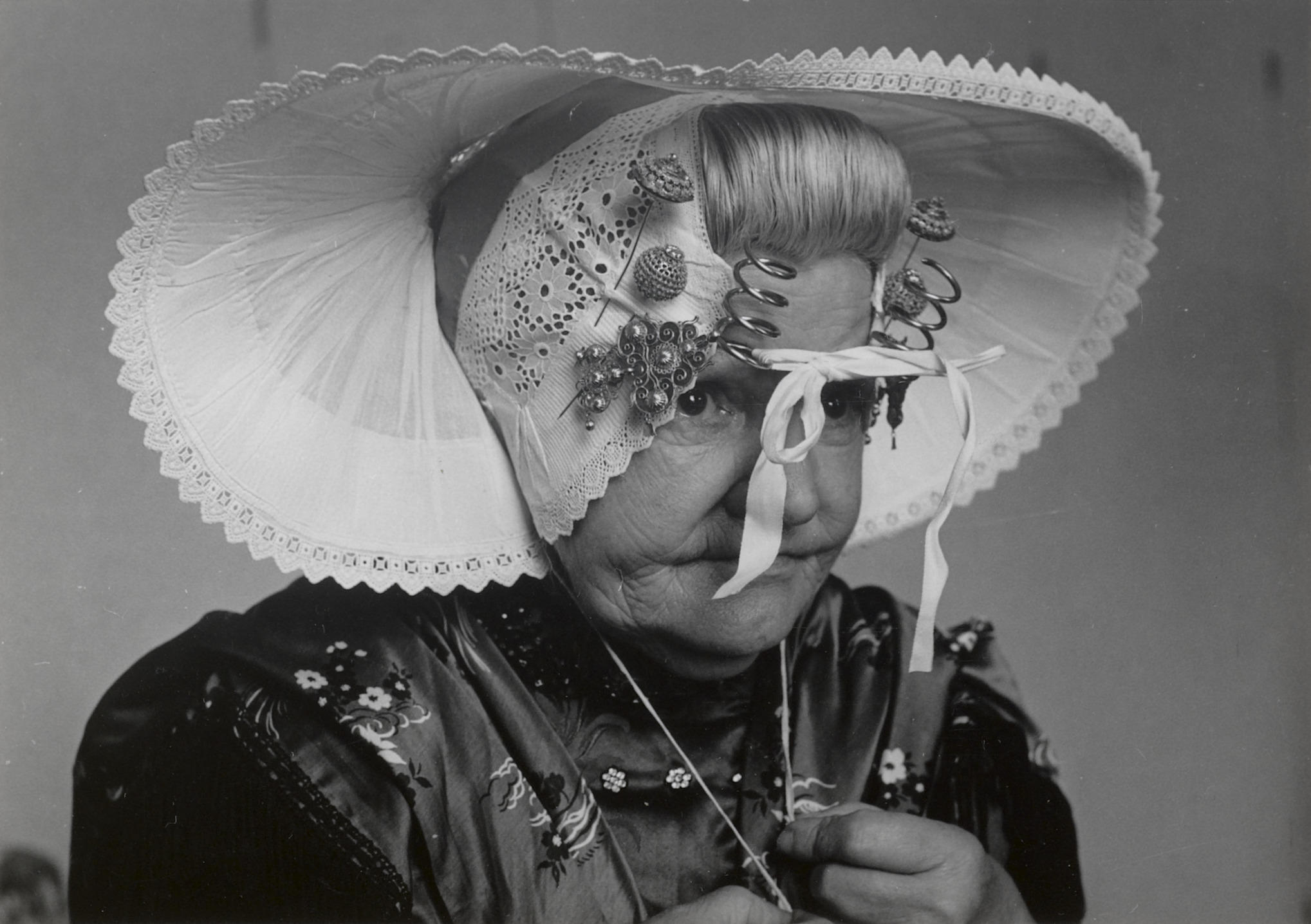 Mevrouw Theune-de Keuning uit Middelburg, gekleed in de streekdracht van Nieuw- en Sint Joosland, demonstreert het 'kapzetten'. De opgemaakte bovenmuts is op de ondermuts vastgespeld. De keelbanden van de muts worden op gelijke lengte strak naar beneden getrokken voordat ze onder de kin worden gestrikt. De krullen van het oorijzer zijn met een bandje aan ...