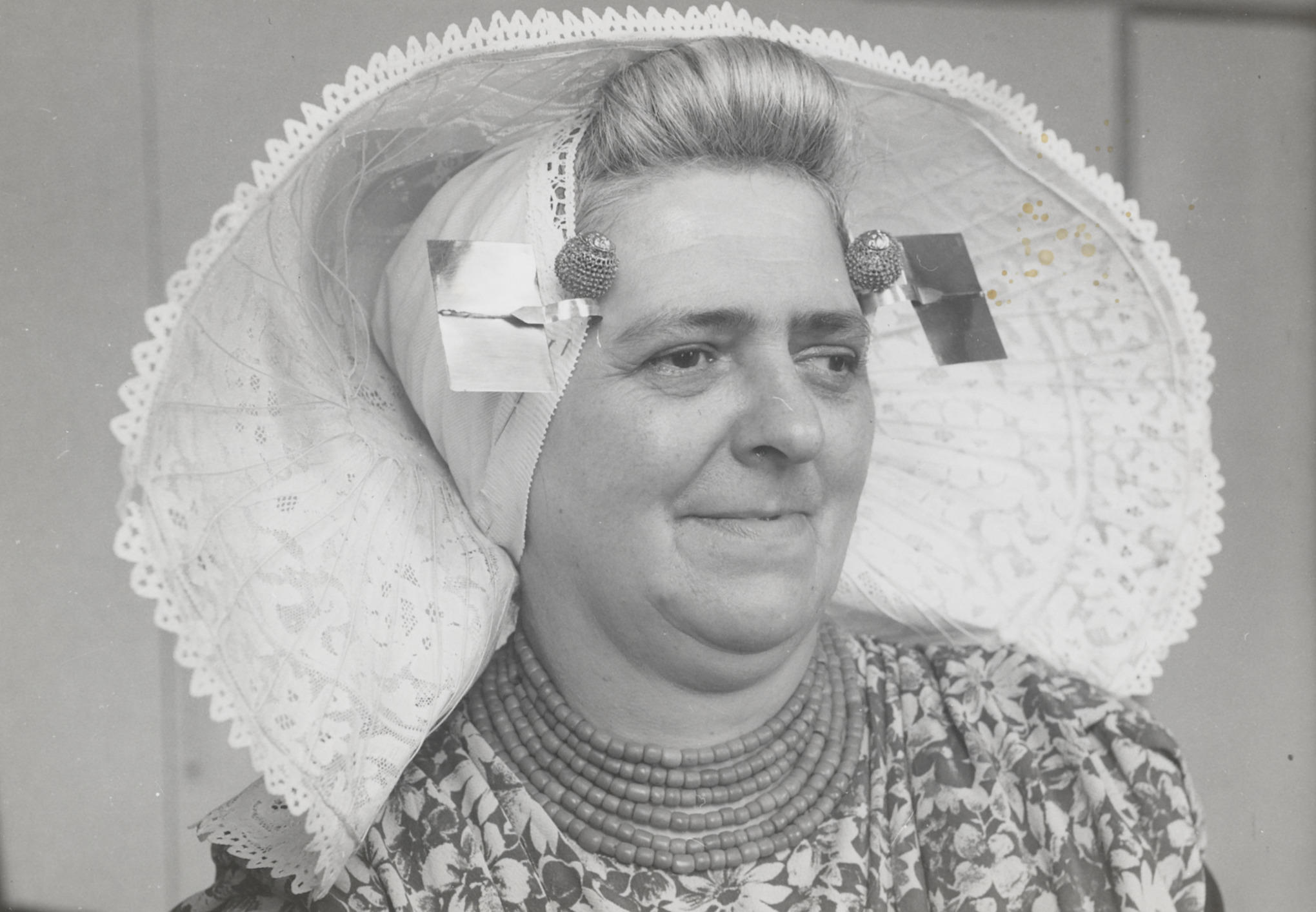 Mevrouw Dobbelaar in protestantse Zuid-Bevelandse streekdracht. Ze is gekleed in zondagse dracht. Over de witte ondermuts draagt ze een muts van Rijselse kloskant. In de ondermuts is een oorijzer gespeld met aan de beide uiteinden rechthoekige gouden 'stikken'. Het oorijzer wordt vastgestoken met gouden mutsspelden, de zogenoemde kroonspelden. Vergelijkbare spelden werden ook op Walcheren gedragen, ...