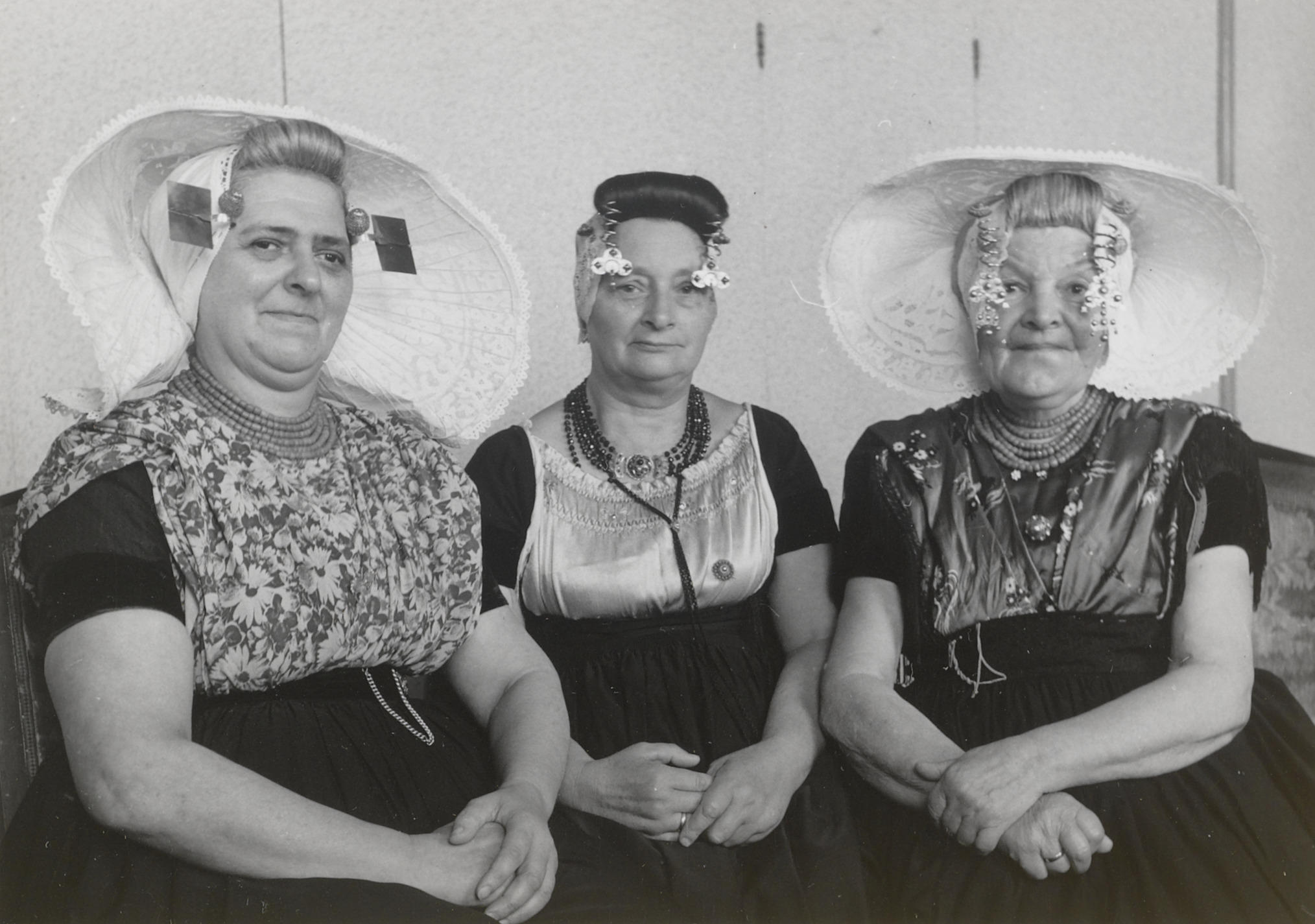 Drie vrouwen in verschillende Zeeuwse streekdrachten. Links zit mevrouw Dobbelaar in protestantse Zuid-Bevelandse streekdracht. In het midden zit Francina Dekker-Jacobse in Walcherse streekdracht. Mevrouw Theune-de Keuning zit rechts en is gekleed in de streekdracht van Nieuw- en St. Joosland.