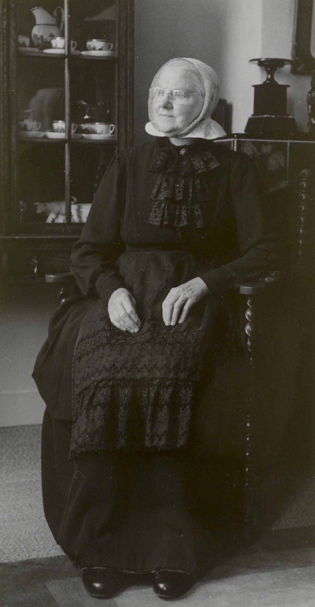 Mevrouw Risseeuw-Tromp uit Middelburg in Cadzandse streekdracht. Ze draagt een schootjak met een rok en een schortje met broderieborduursel. Op het jak heeft ze een zwart kanten jabot. Onder de kornetmuts draagt ze een zwarte ondermuts met een paar mutsenbellen, die zichtbaar zijn in de voorstrook van de kornetmuts (ter hoogte van de mond). De ...