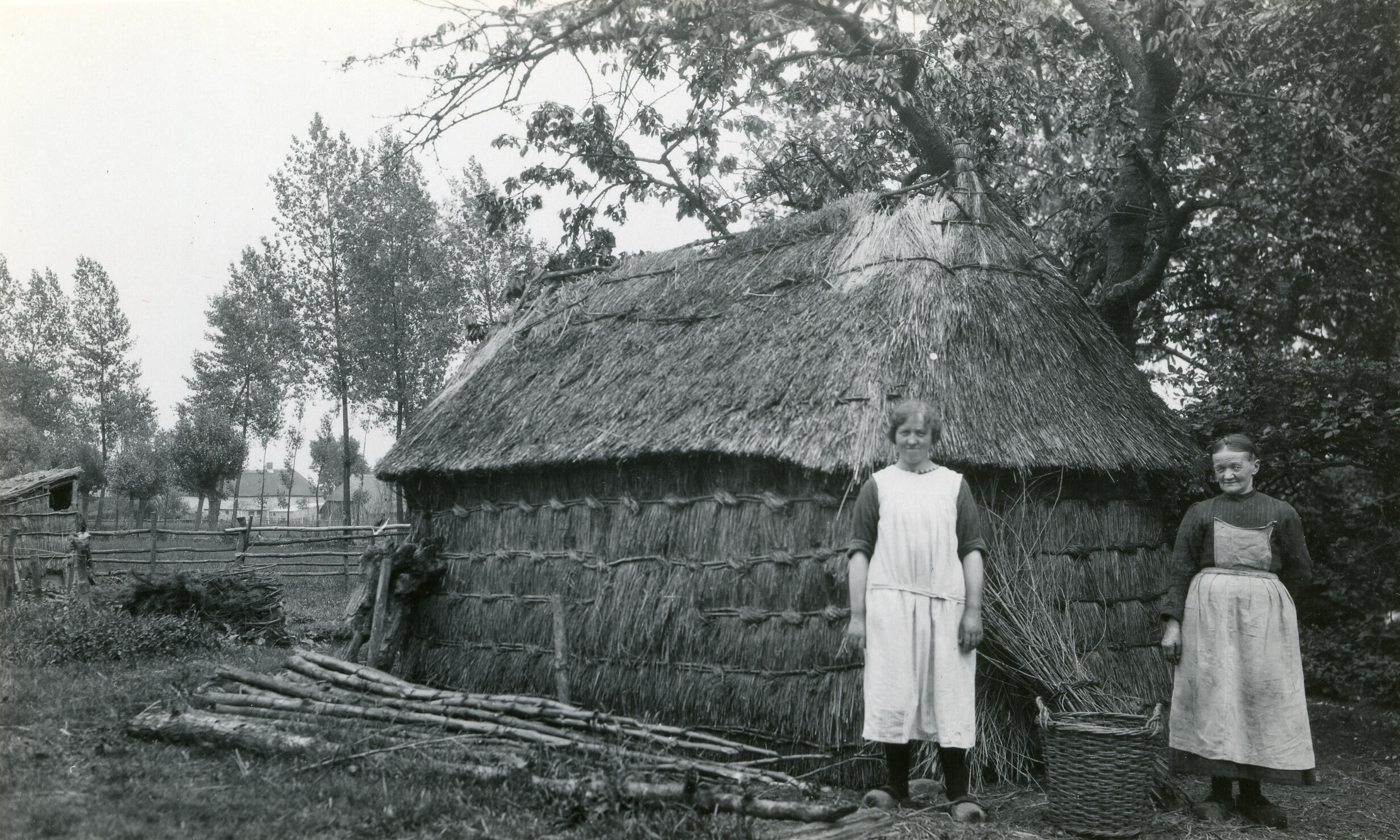 Twee vrouwen naast een schuurtje bij een boerderij in Nistelrode. De wanden van het schuurtje zijn van strovlechtwerk.