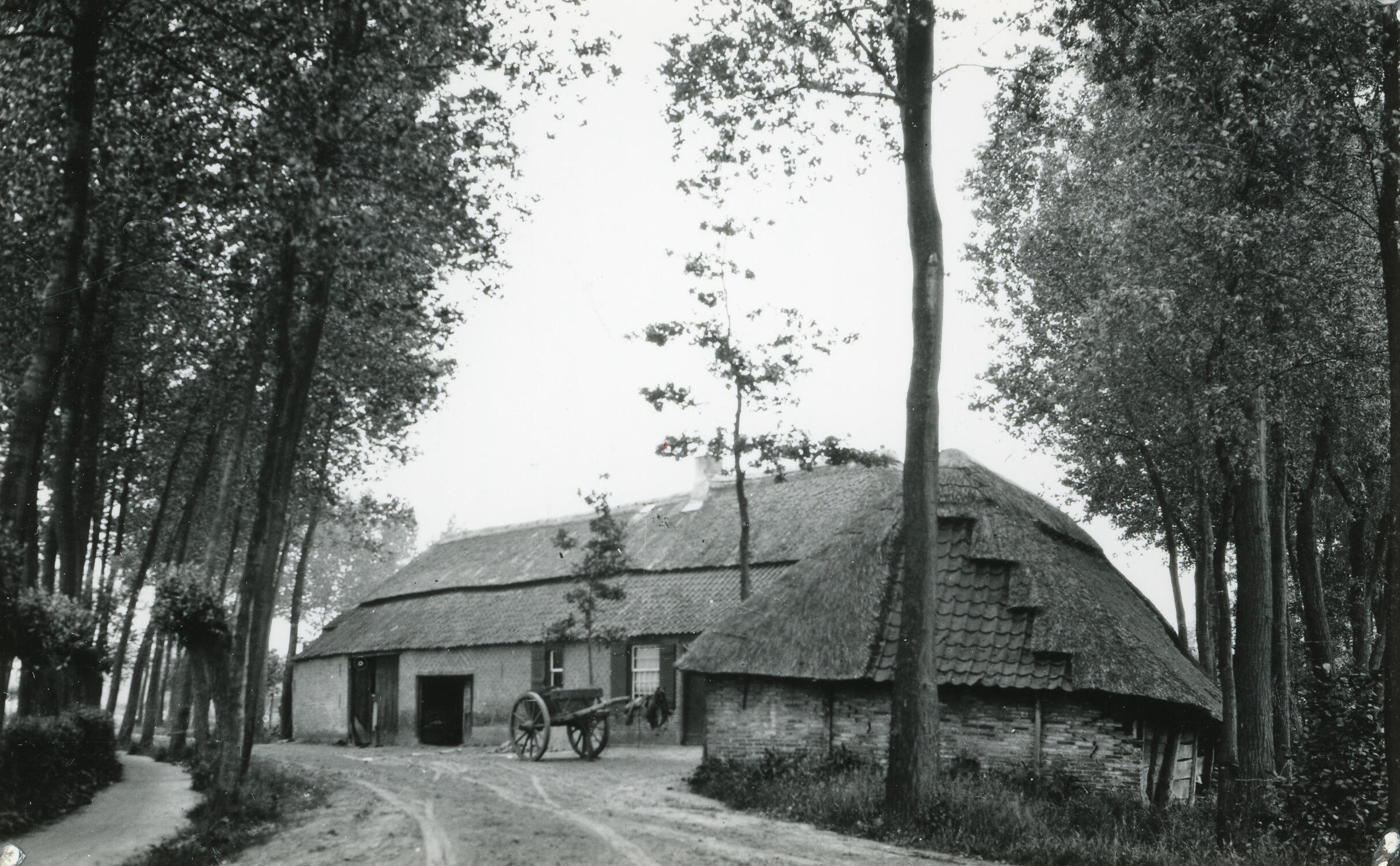 Een boerderij met een schuur in Veghel. Op het erf staat een kar.
