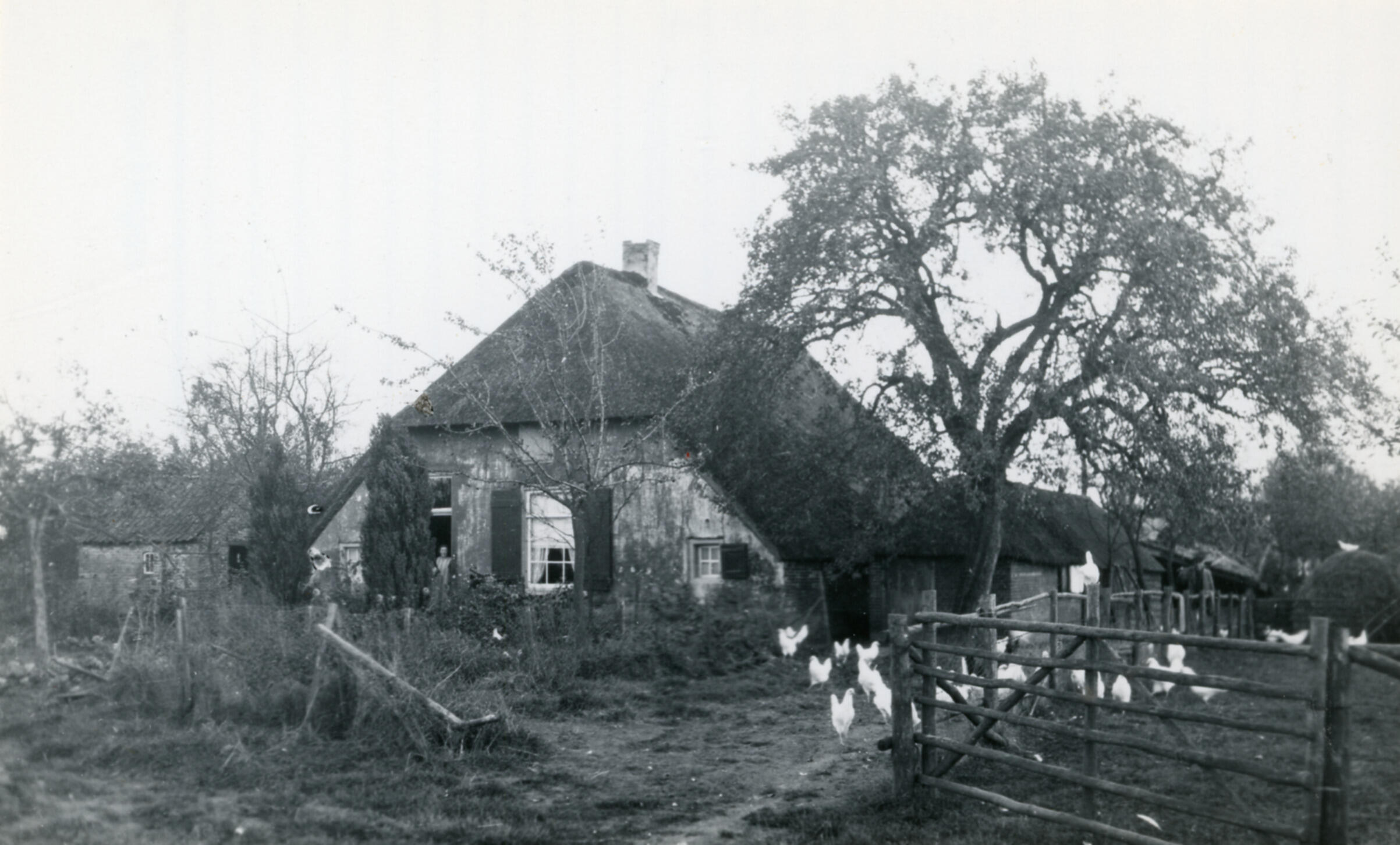 Een boerderij in Veldhuizen, een buurtschap bij Ede. Op het erf loopt een toom kippen.