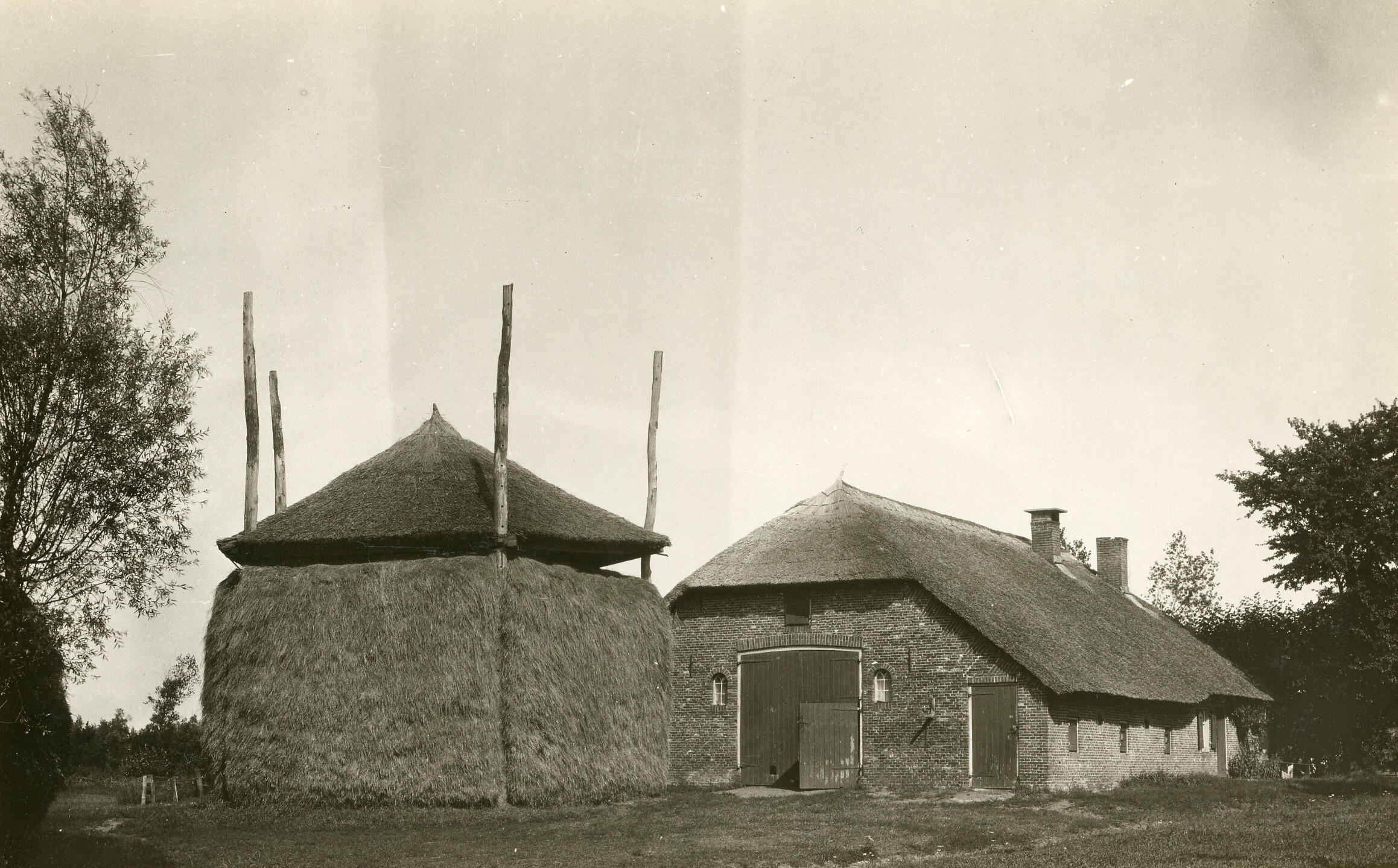 Achterzijde van een boerderij in Oldebroek. Achter de boerderij staat een vierroedige hooiberg.