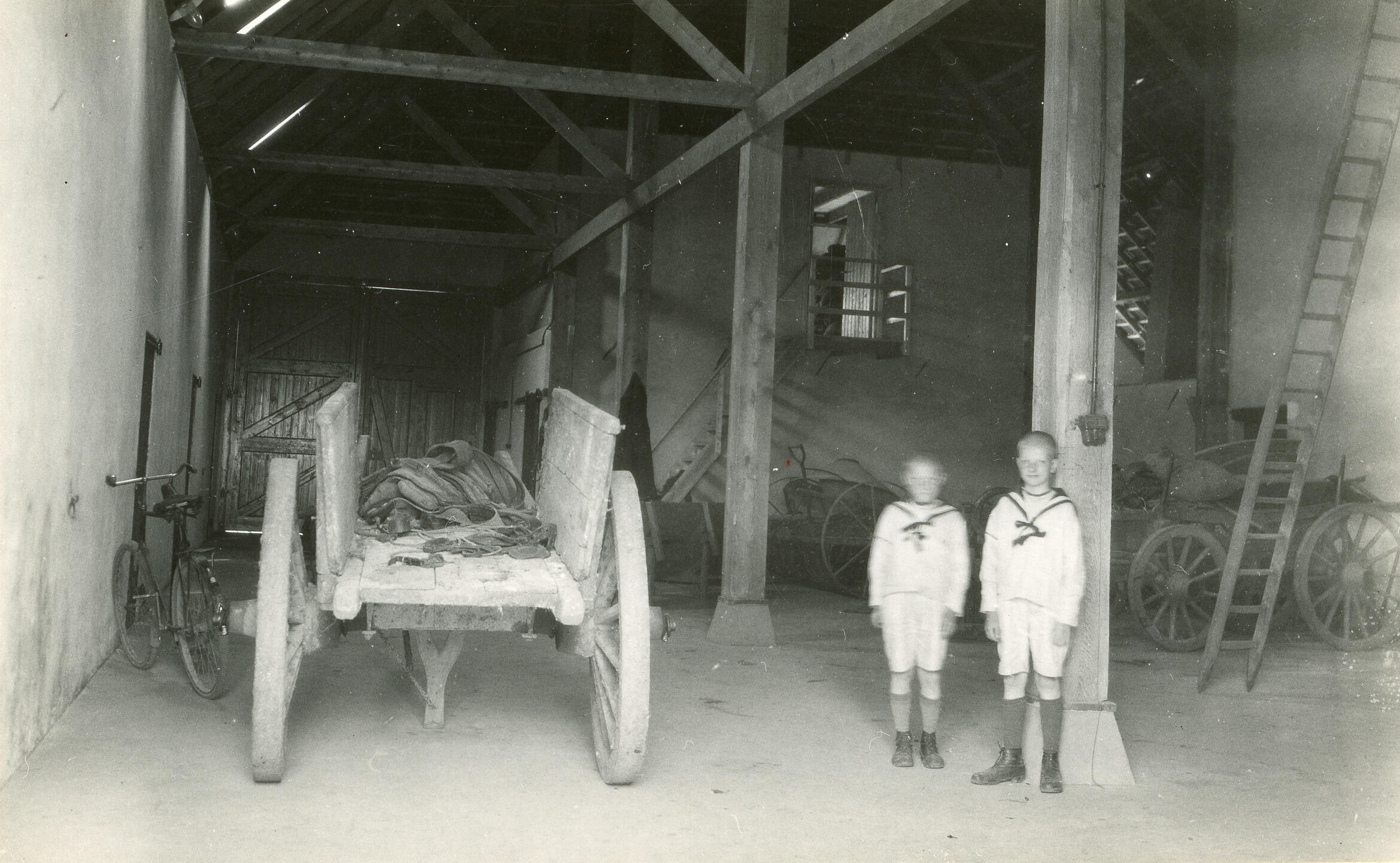 Het interieur van het bedrijfsgedeelte van een boerderij in Slijk-Ewijk, in de Overbetuwe. In de schuur staan twee jongens, gekleed in matrozenpakjes.