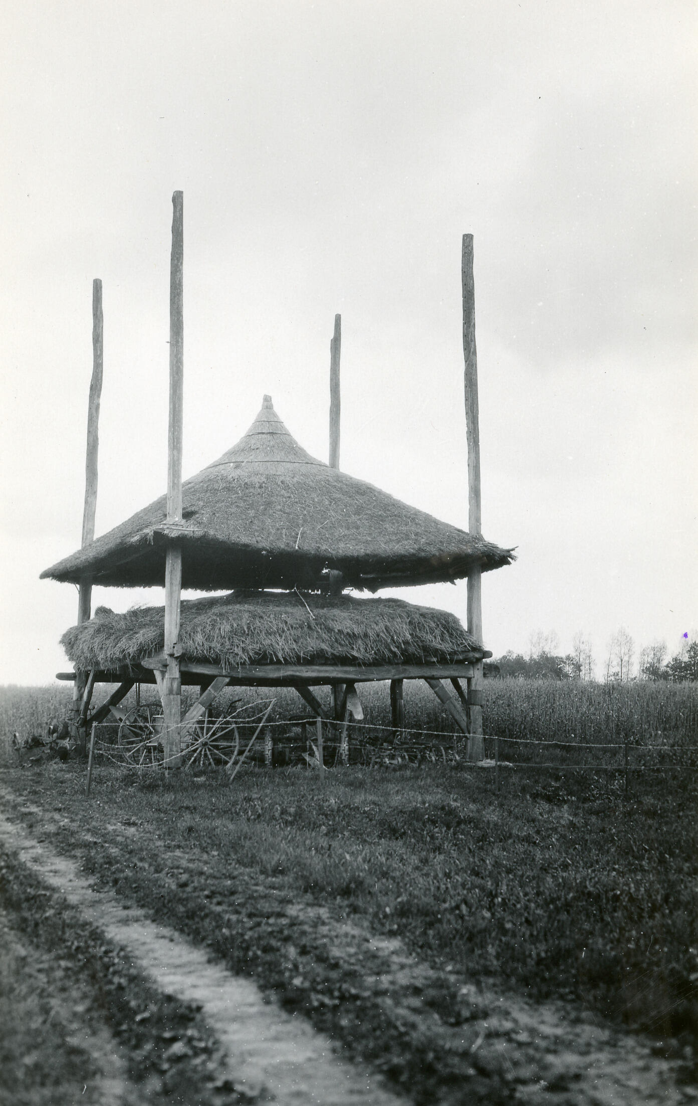 Een hooiberg in Haarlo, een dorp tussen Borculo en Eibergen. Onder de hooiberg staat landbouwgereedschap.
