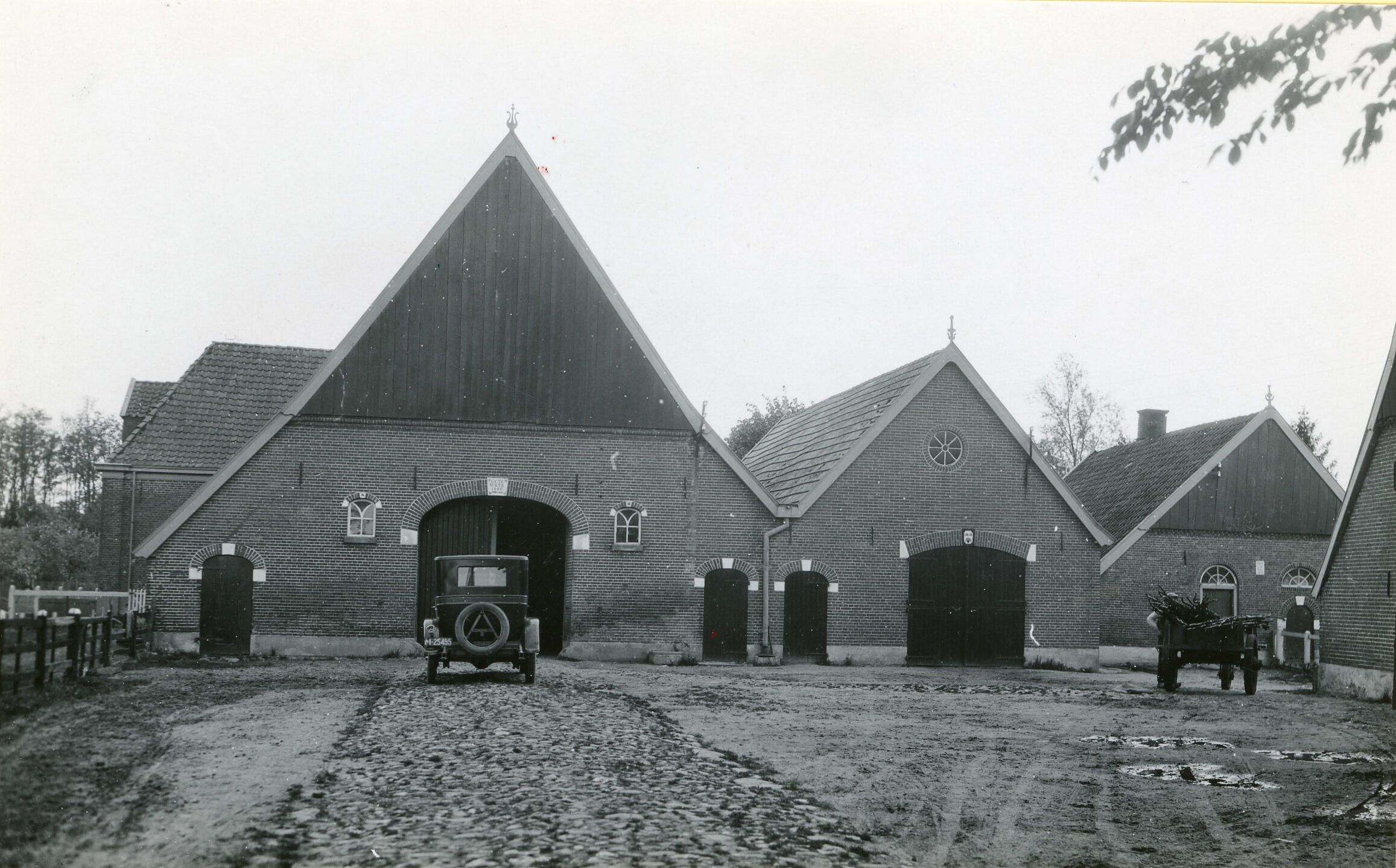 Achterzijde van proefboerderij 'Kotte' aan de Eibergseweg 58 in Haarlo. Op het erf staan een auto en een driewielskar.