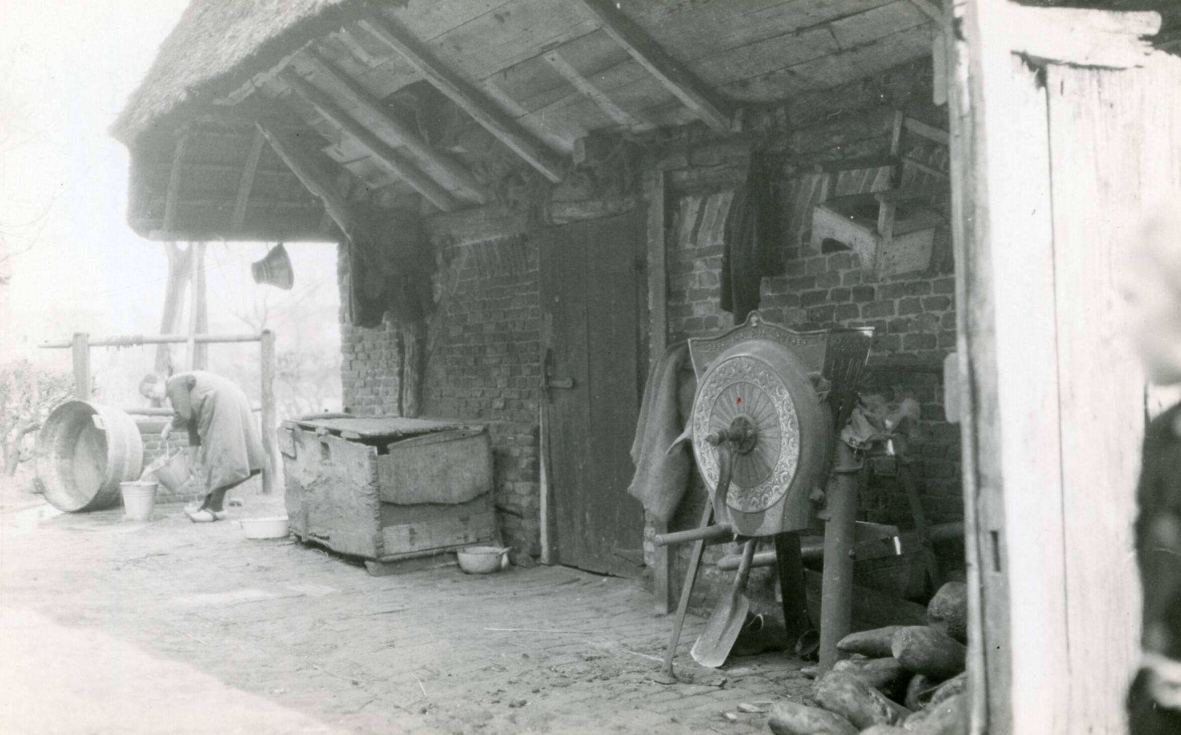 Overstek van een schuur bij een boerderij in Liempde. Links is een vrouw aan het werk bij een waterput. Rechts, onder het overstek, staat een bietensnijmachine.
