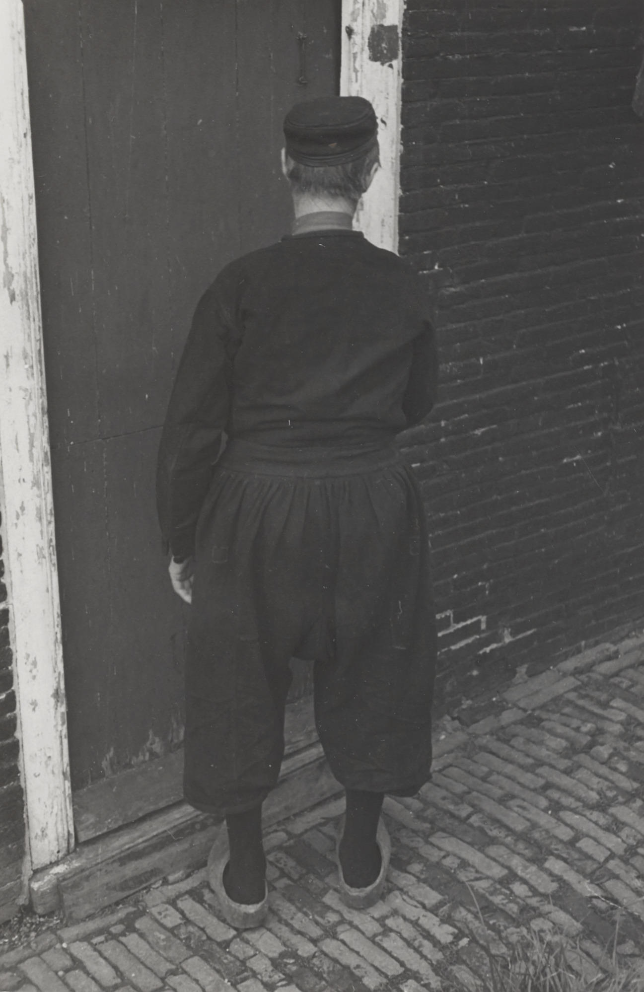 Man in Volendammer streekdracht. Hij draagt een 'Schokker broek' en 'polkabaadje'. Dit model broek werd aan het eind van de negentiende eeuw nog algemeen gedragen, maar op het moment van de opname (1946) was deze broek reeds uit de mode.