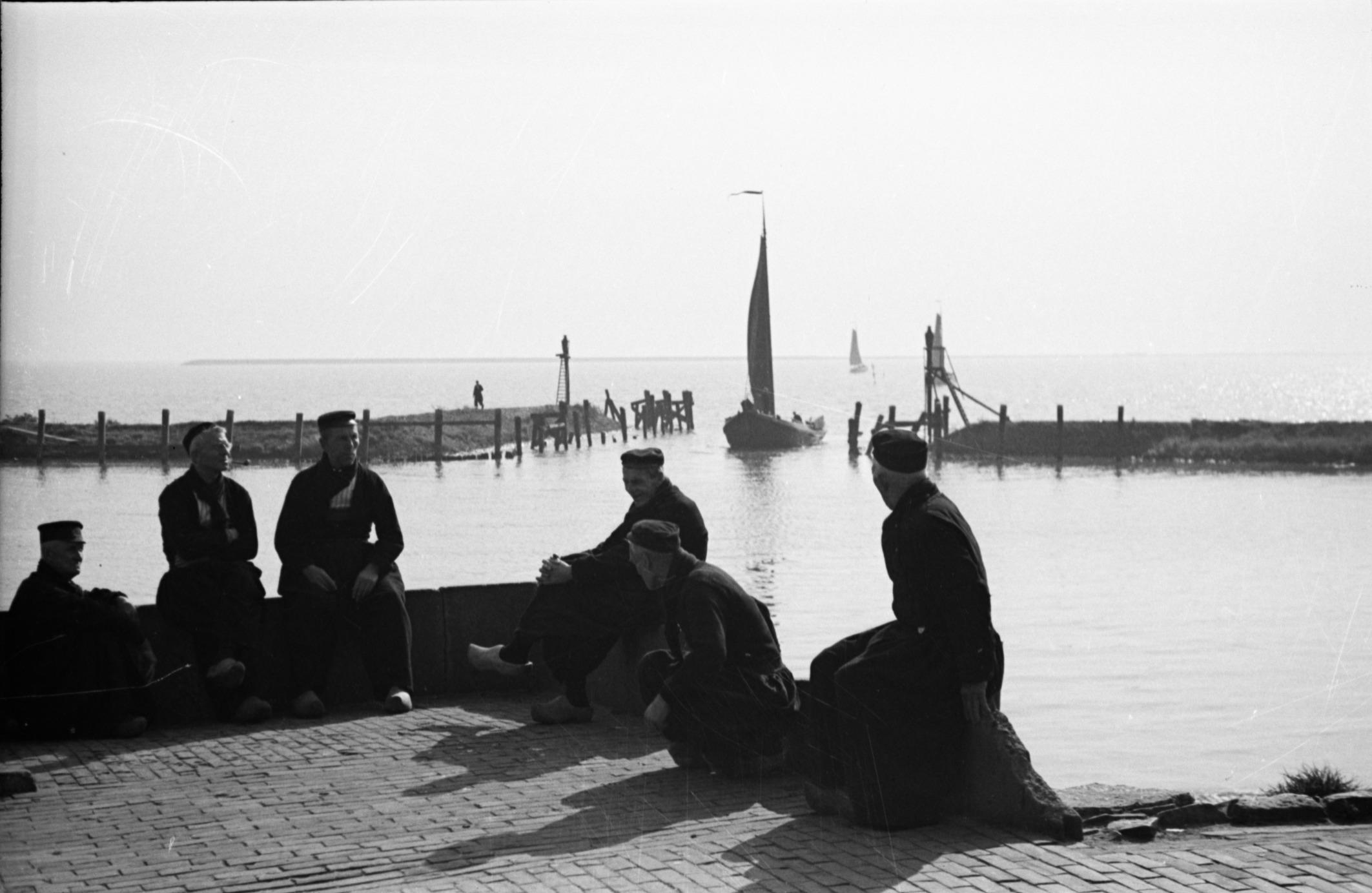 Ontmoetingsplaats aan de haven, Volendam, 1946 (zwart-wit foto)