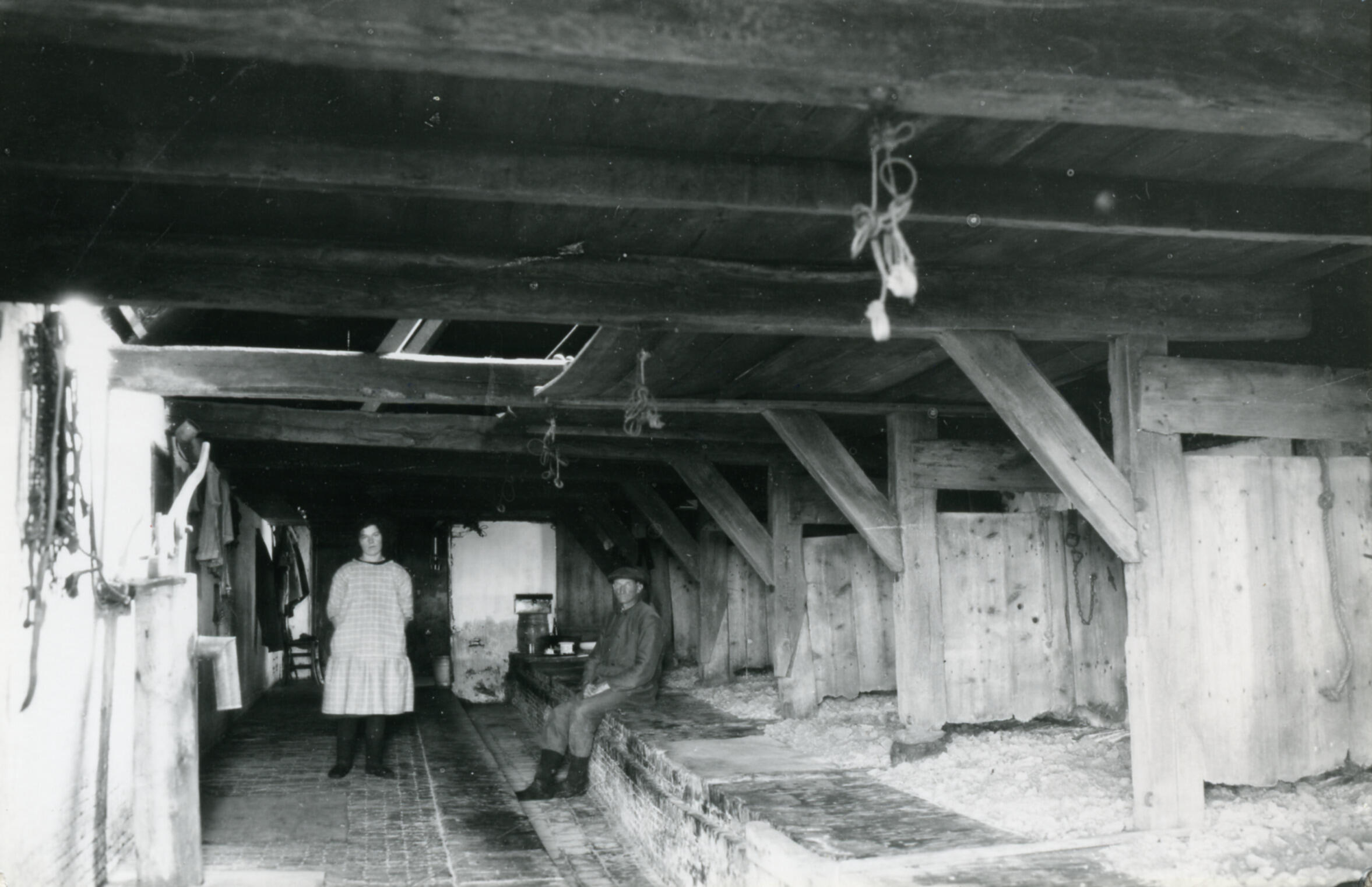 Boerin en boer in een koestal, Goëngamieden, 1935 (zwart-wit foto)