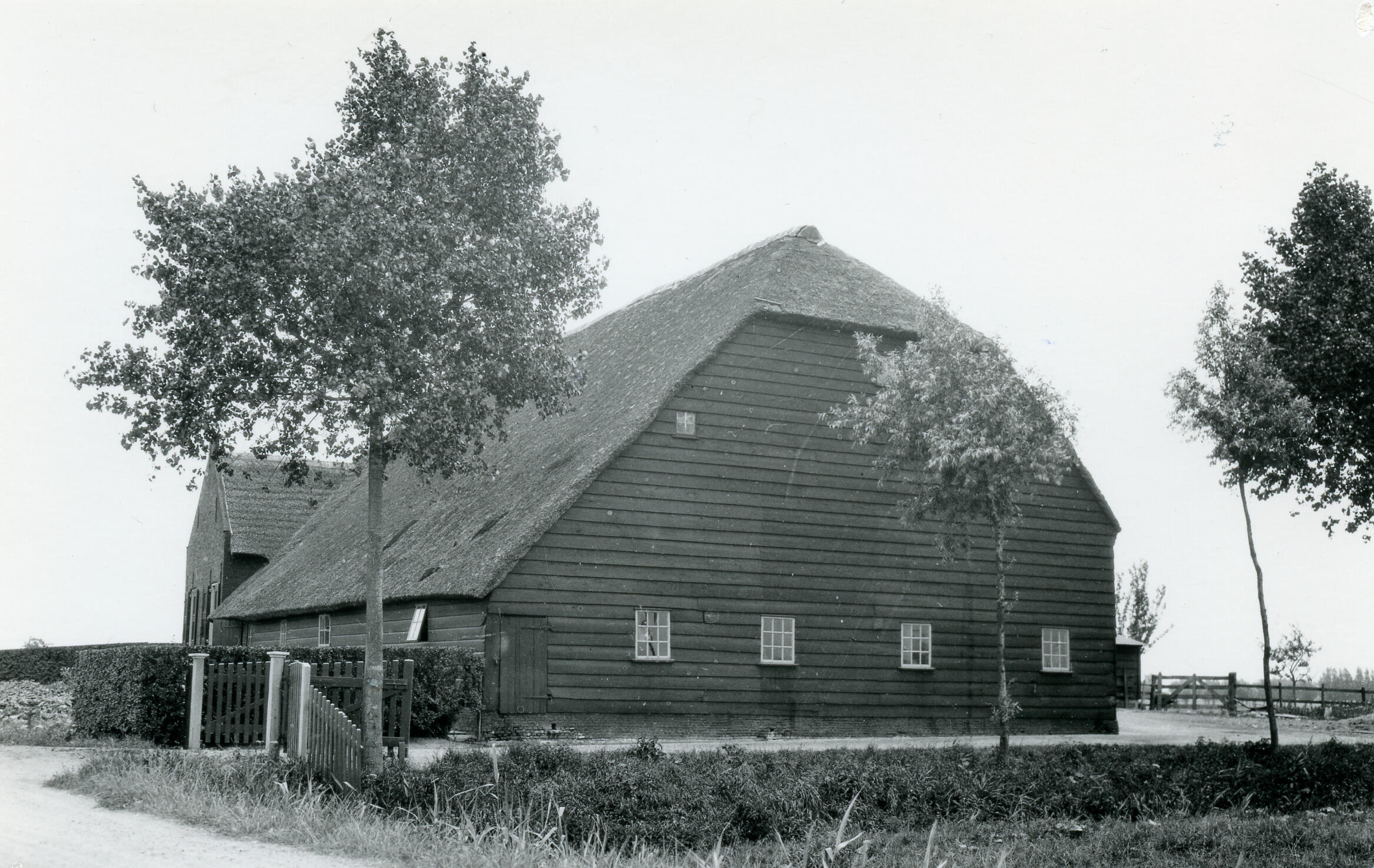 De achterzijde van een boerderij in Hendrik-Ido-Ambacht. Het bedrijfsgedeelte heeft houten wanden. De boerderij ligt aan de weg van Hendrik-Ido-Ambacht naar Rijsoord.