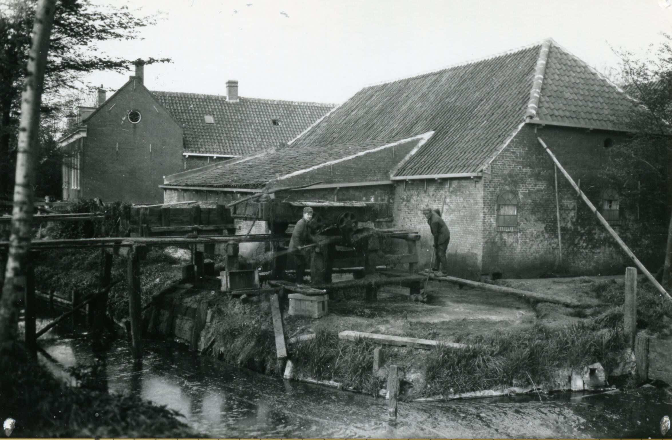 Stallen bij een boerderij in Overschie. Op deze boerderij werden de koeien gevoerd met zogenoemde spoeling, het afval van stokerijen in Schiedam en omgeving. De spoeling werd per spoelingschuit over water aangevoerd en via goten naar de stallen getransporteerd. Boeren die hun koeien en/of varkens met spoeling voerden, werden spoelingboeren genoemd.