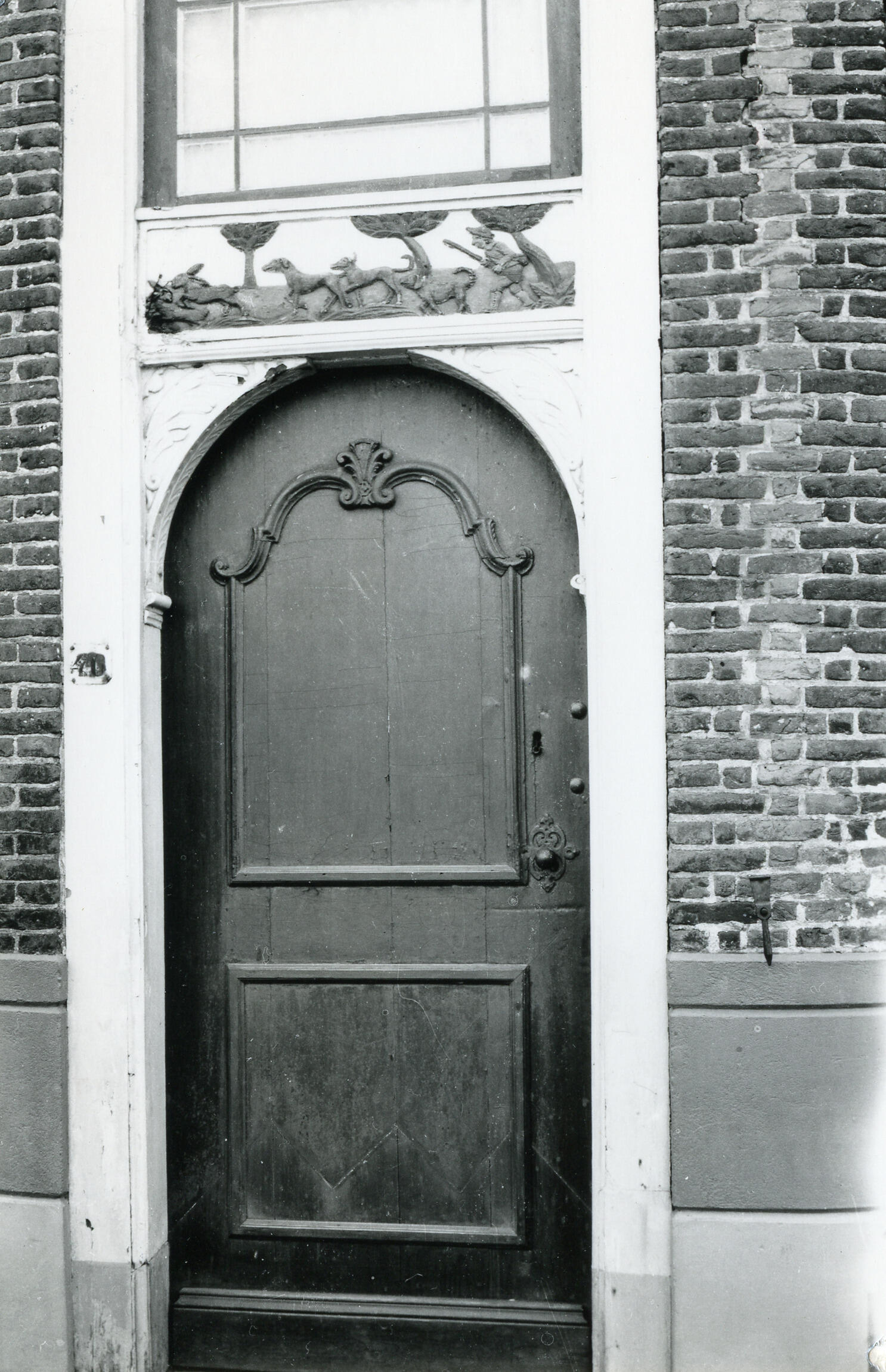 Voordeur van een pand aan de Dorpsweg 26 in Hoogblokland. In het deurkalf is een jachtscène uitgesneden.