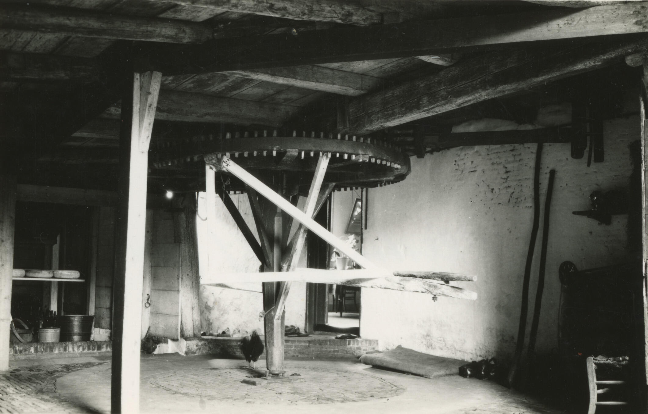 Rosmolen in een boerderij, Bleskensgraaf, circa 1930-1940 (zwart-wit foto)