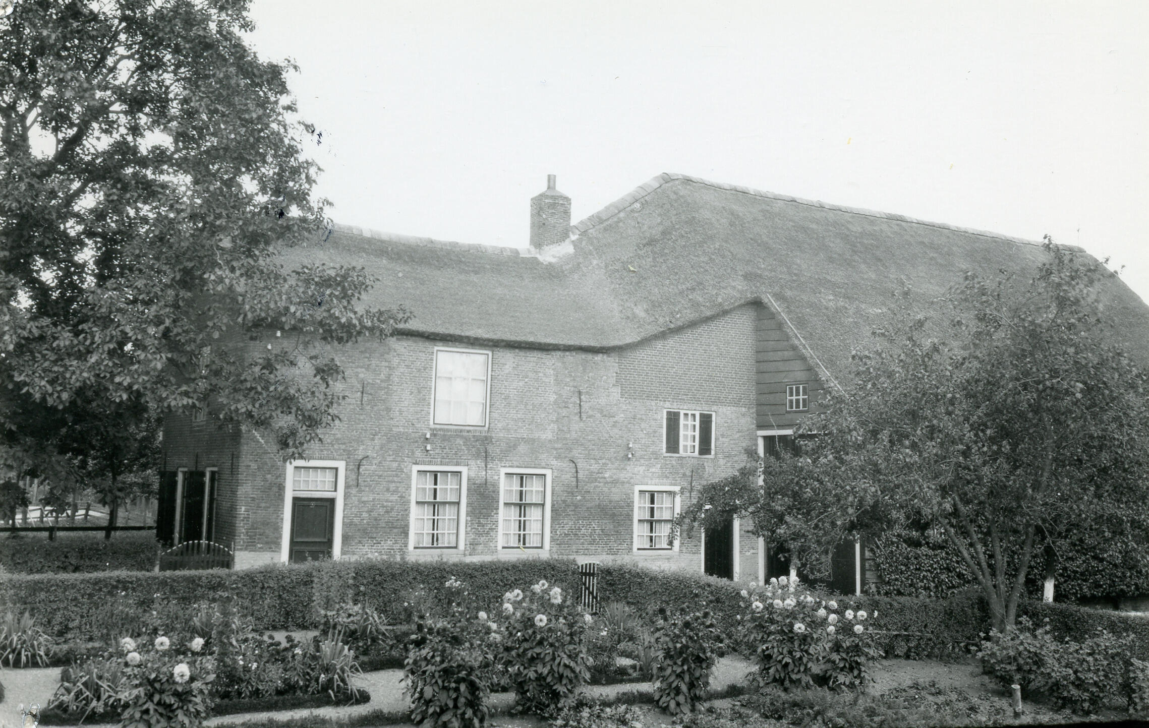 Boerderij aan de Kleine Giessen in Hoornaar. Op de voorgrond ligt een siertuin met dahlia's.