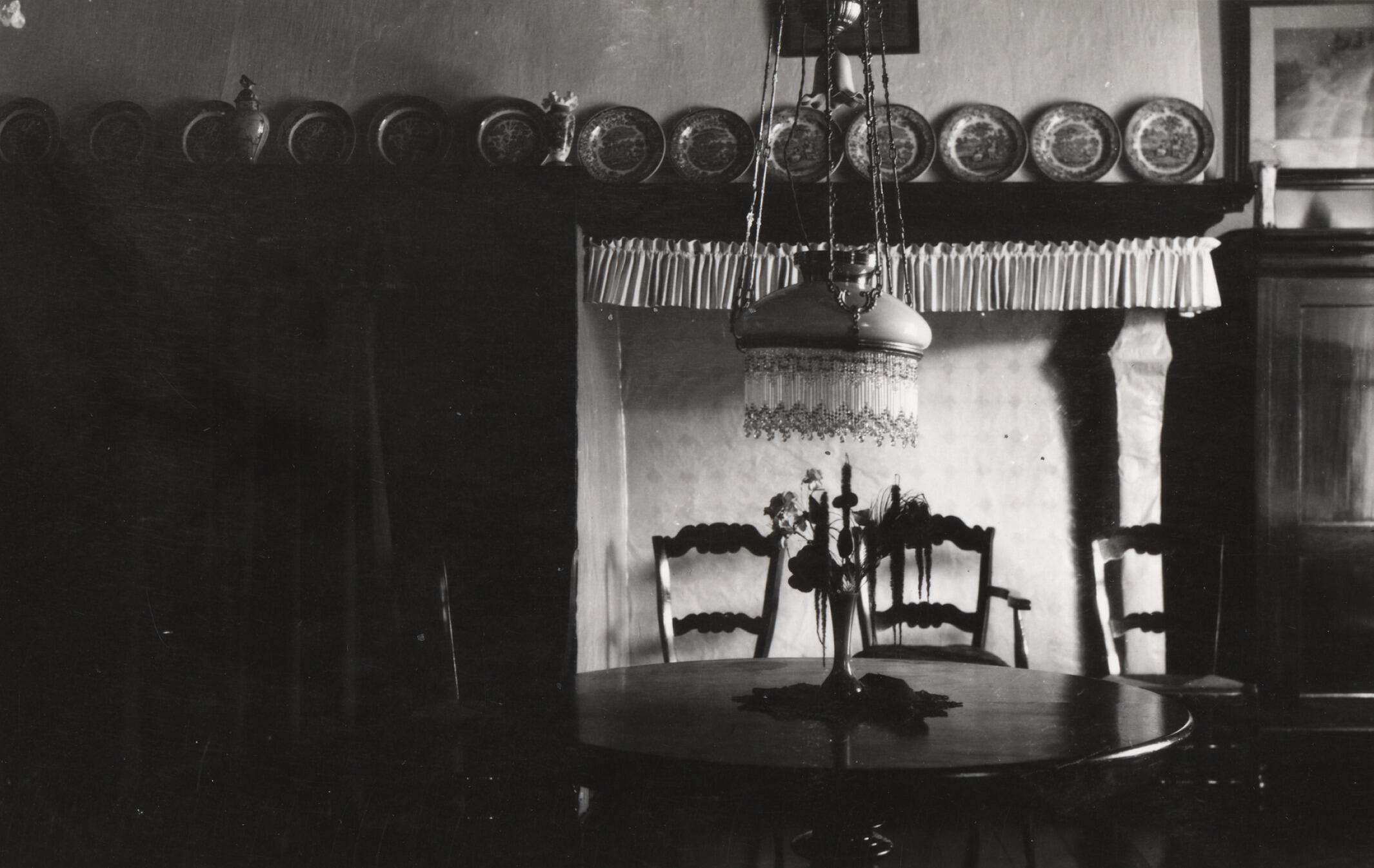 Het interieur van de woonkeuken in een boerderij in Achterberg. Boven de tafel hangt een olielamp met een kralenrand.