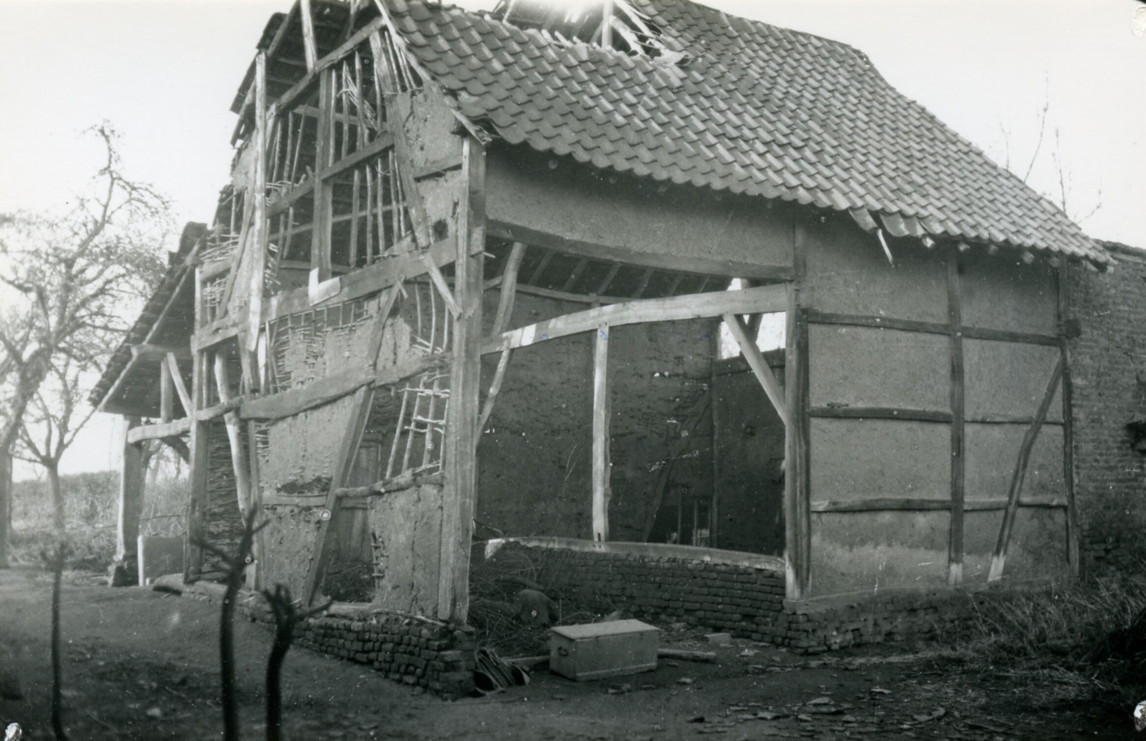 Een vervallen schuur in Guttecoven. De wanden zijn van vakwerkbouw met leemvulling.