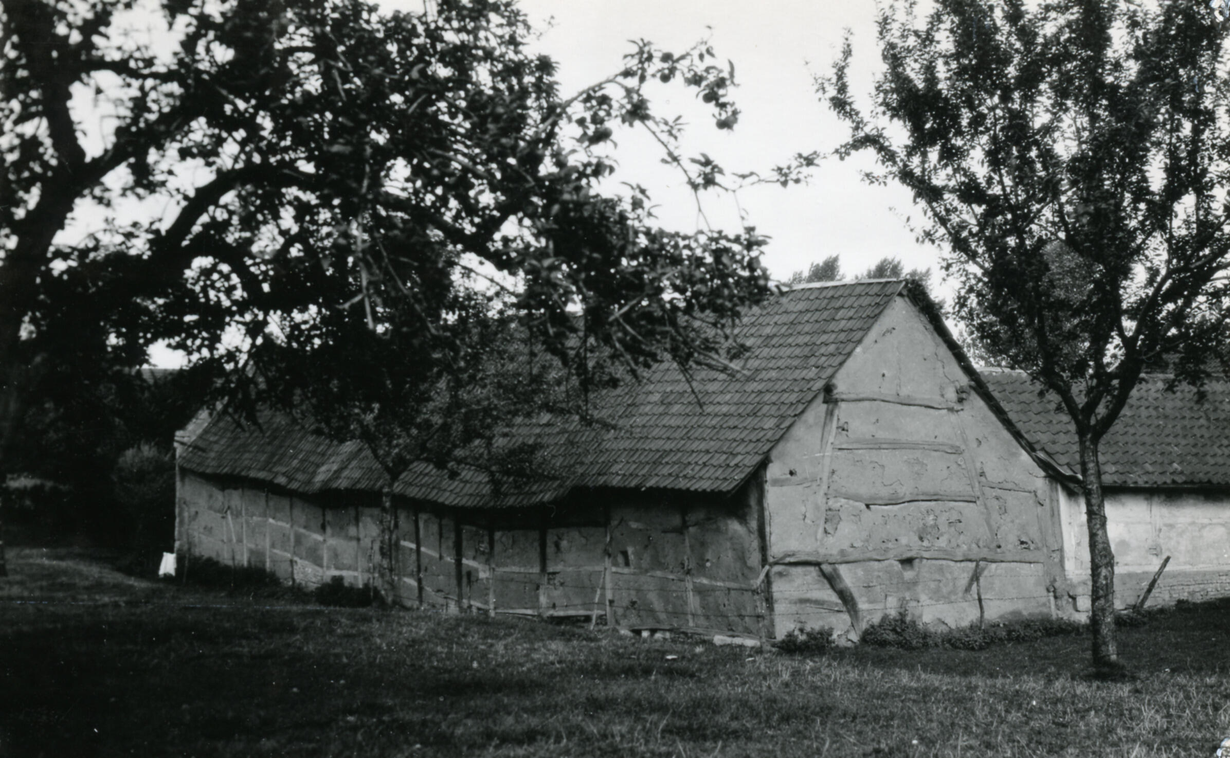 Achterzijde van een boerderij in Scheulder, een dorp bij Margraten. De wanden zijn van vakwerkbouw, opgevuld met leem.