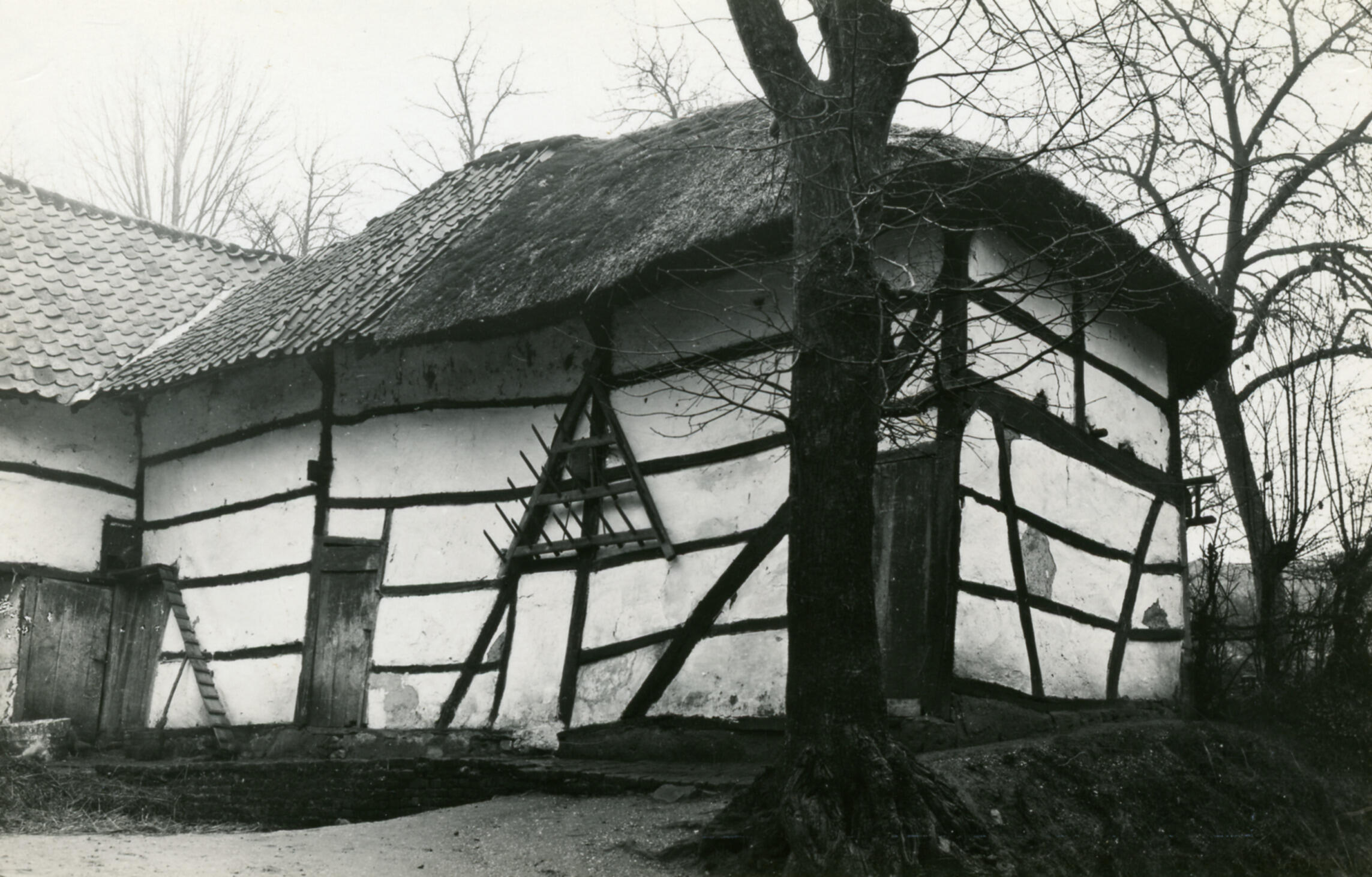 Een boerderij in Sweikhuizen, bij Geleen. De wanden zijn van vakwerkbouw met leemvulling. Links is een kippentrapje. Aan de wand hangt een driehoekige eg.