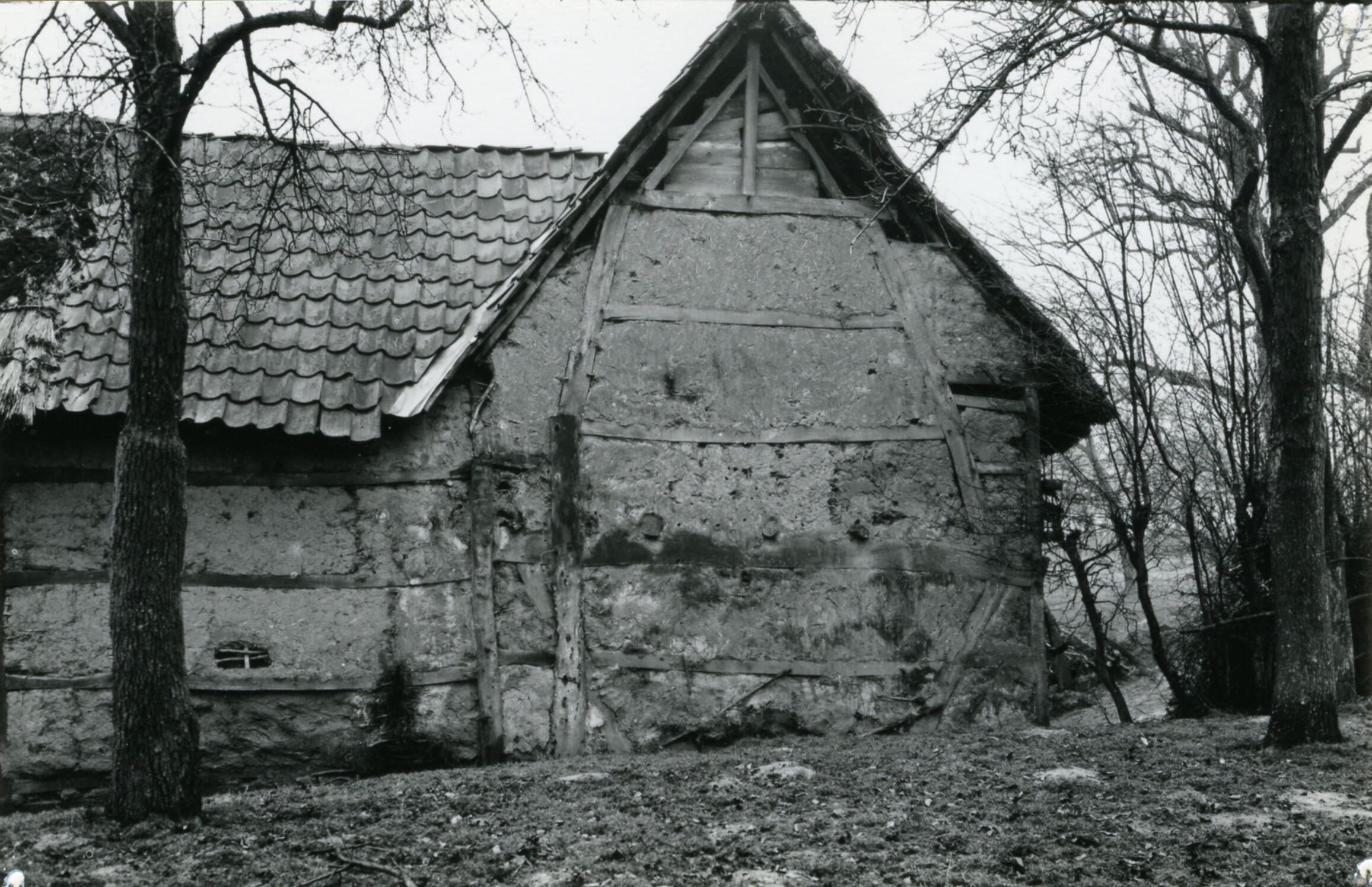 Een boerderij in Sweikhuizen, bij Geleen. De wanden zijn van vakwerkbouw met leemvulling.