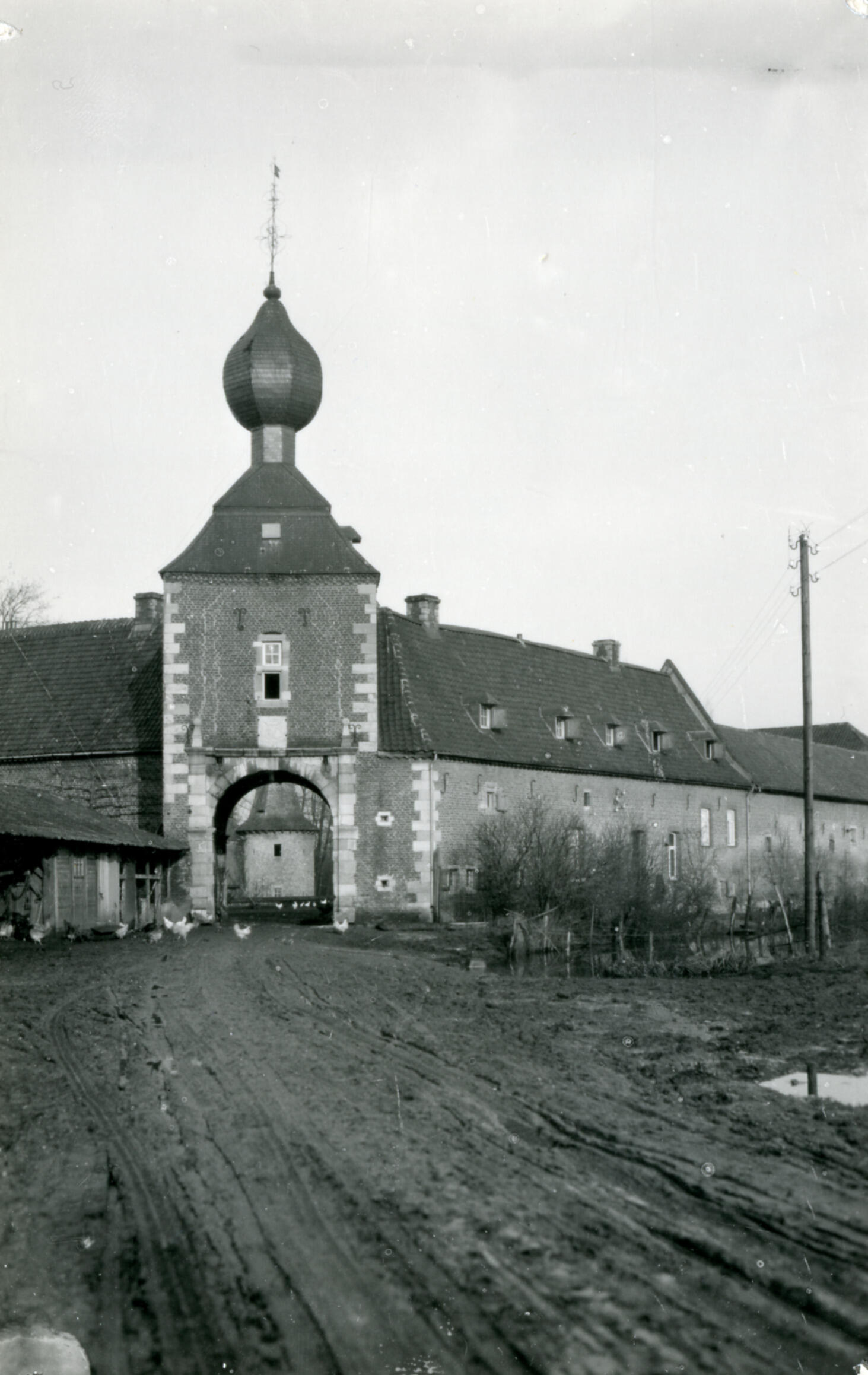 Het poortgebouw van de voorburcht van kasteel Cortenbach in Voerendaal, met een doorkijk naar de binnenplaats van de voorburcht. In de gebouwen aan de binnenplaats is een boerderij gevestigd.