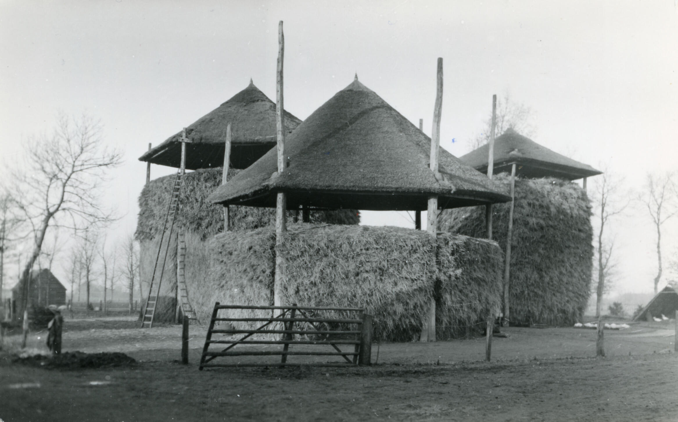 Drie hooibergen op het erf van een boerderij in Kootwijkerbroek.