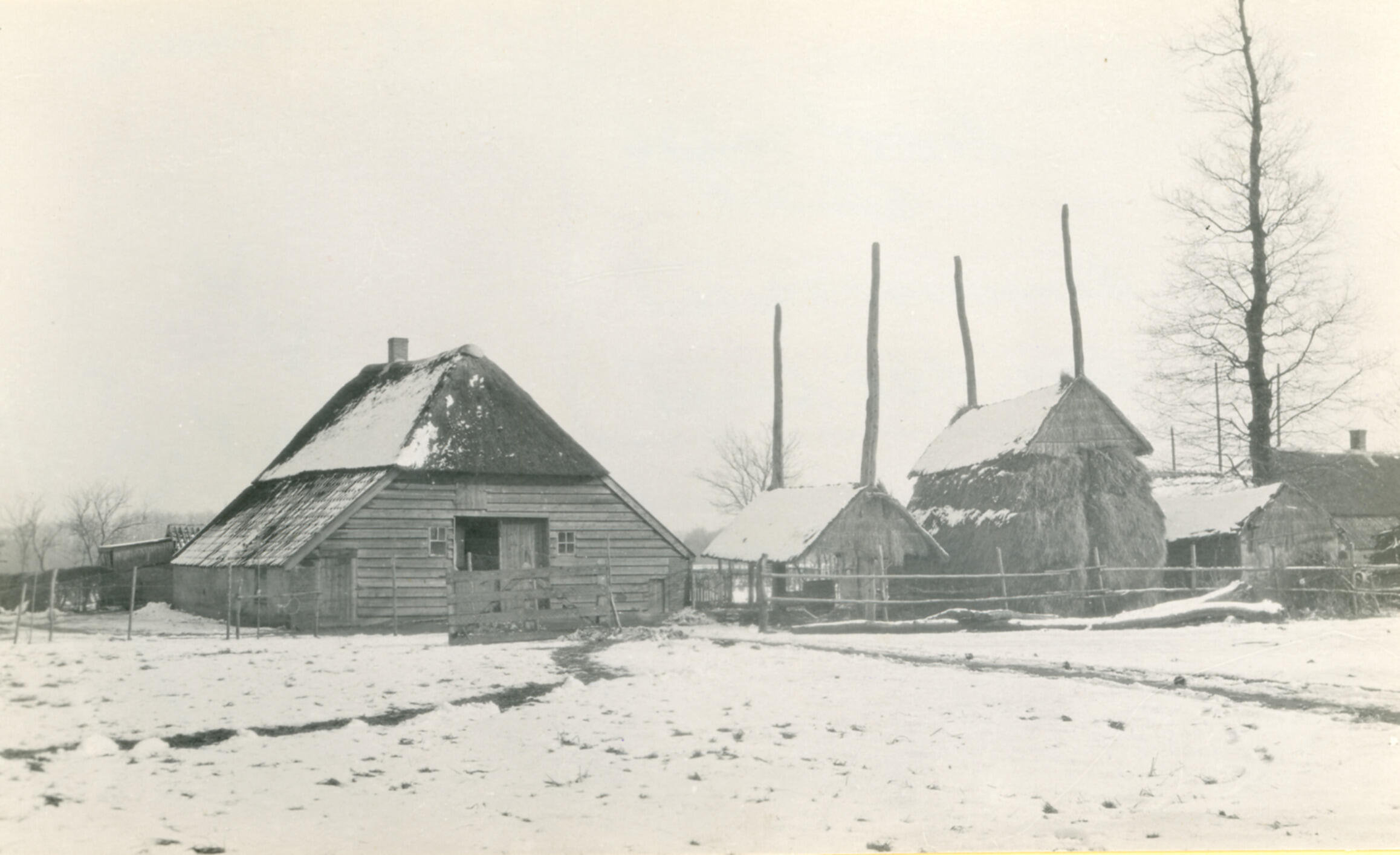 Boerenerf in de sneeuw, Bennekom, 1934 (zwart-wit foto)