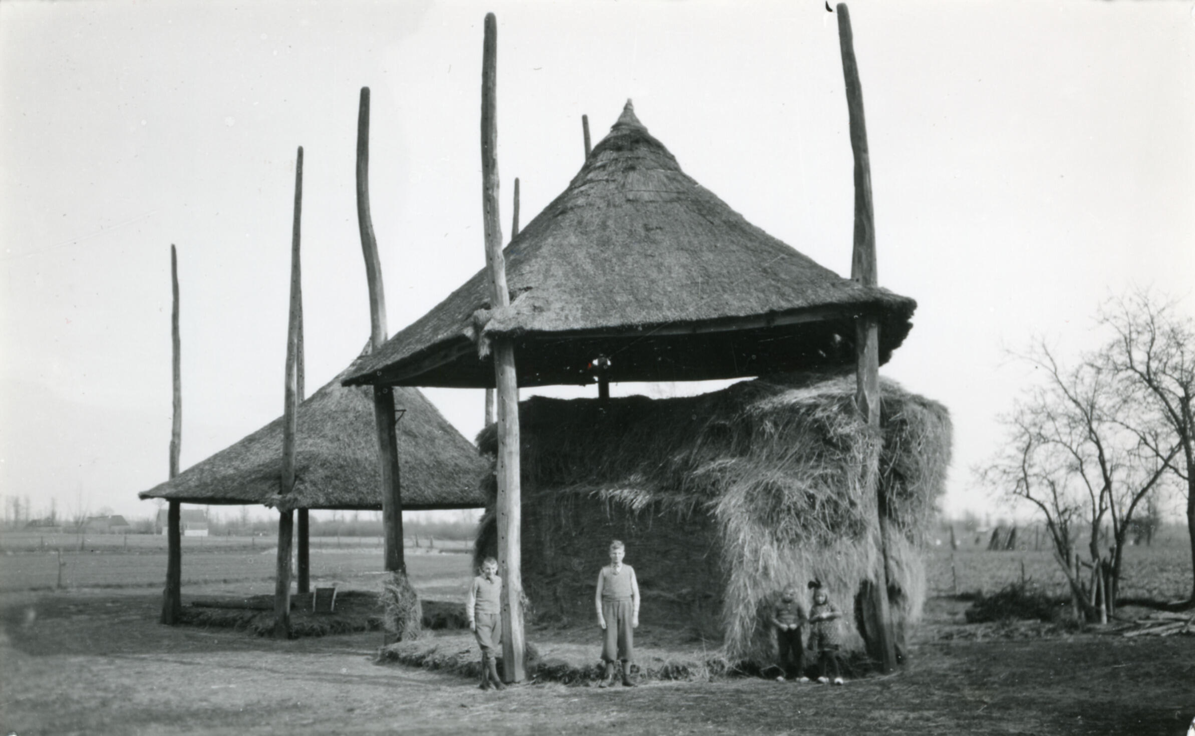 Twee hooibergen op het erf van boerderij 'De Rave' aan de Krommesteeg 39 in De Kraats, een buurtschap bij Bennekom. Voor de hooibergen poseren vier kinderen.