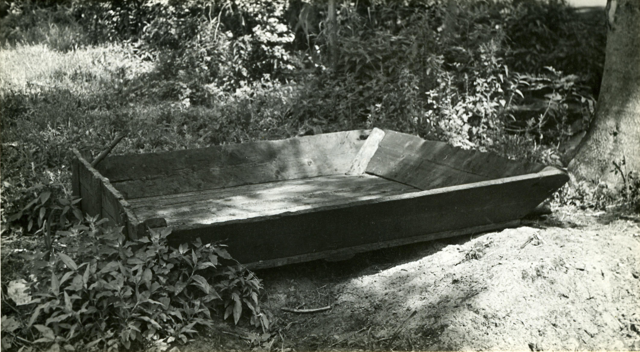 Houten mengbak voor het maken van baggerturf. De bak werd per punter naar de veenderijen vervoerd waar de baggerturf werd gewonnen.