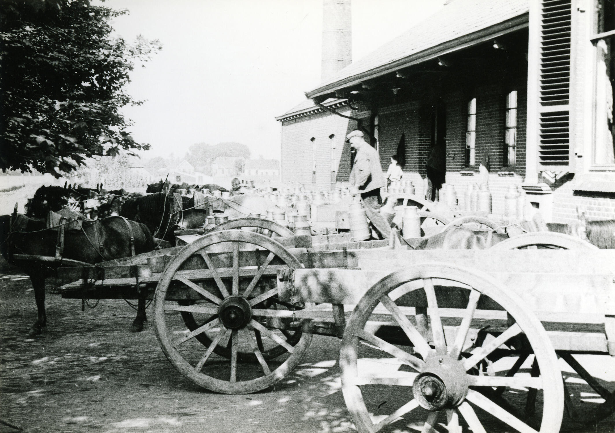 Aanvoer van melk bij de zuivelfabriek in Loenen. De melkbussen worden op wagens aangevoerd.