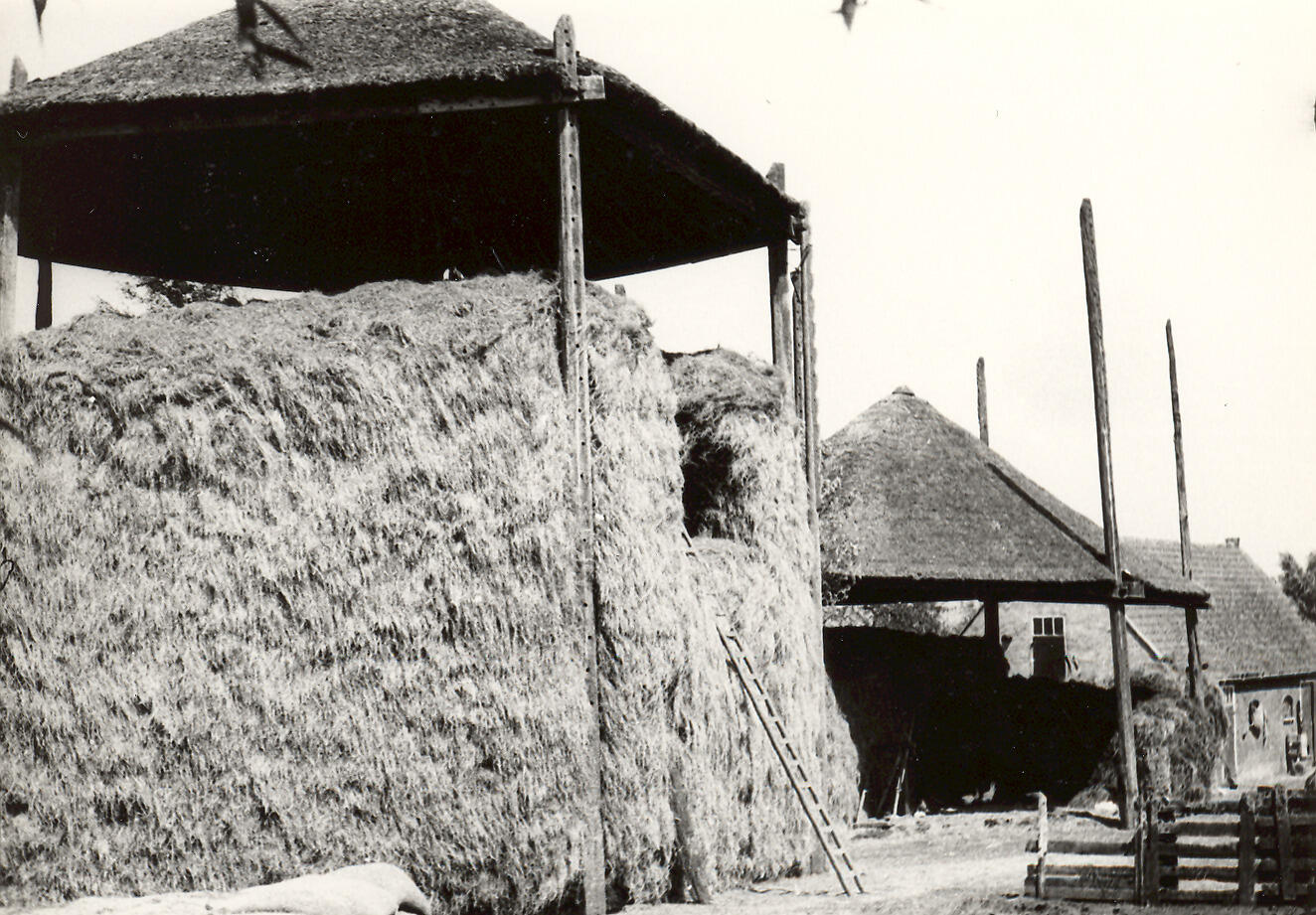 Hooibergen achter een boerderij in Woubrugge.
