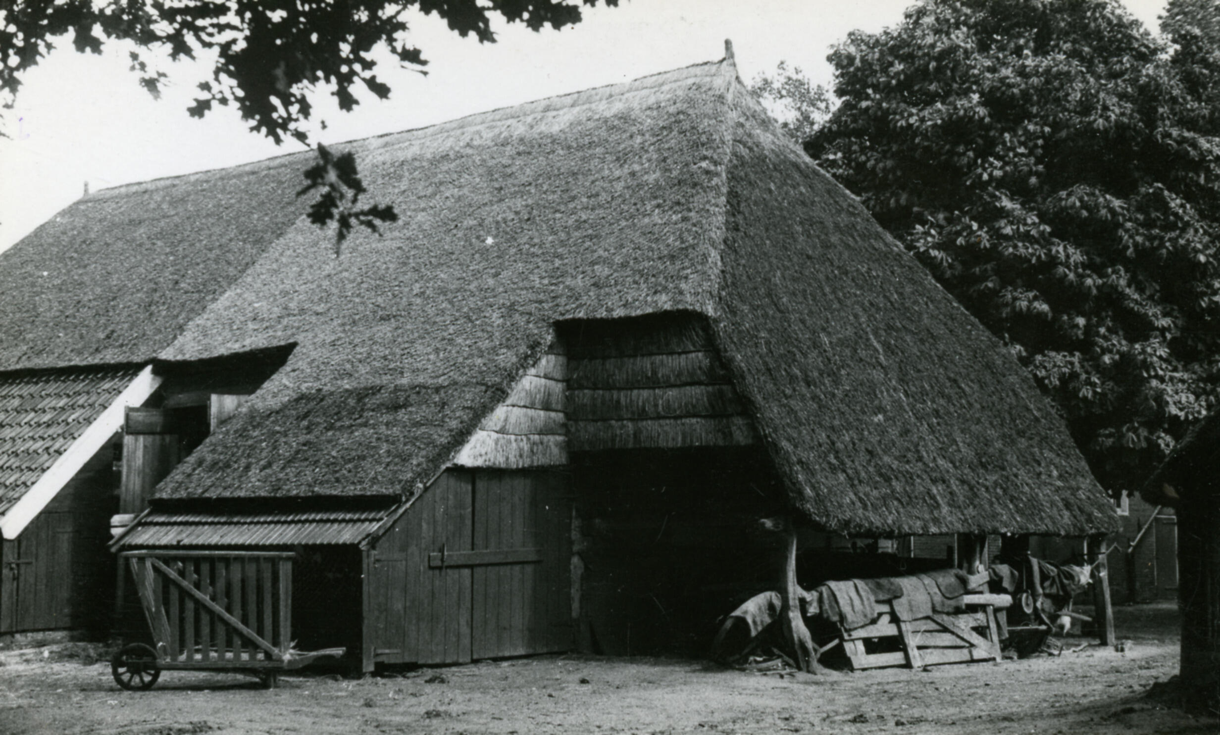 Een schuur op het erf van een boerderij op de Veluwe. Links staat een kruiwagen voor hooitransport.