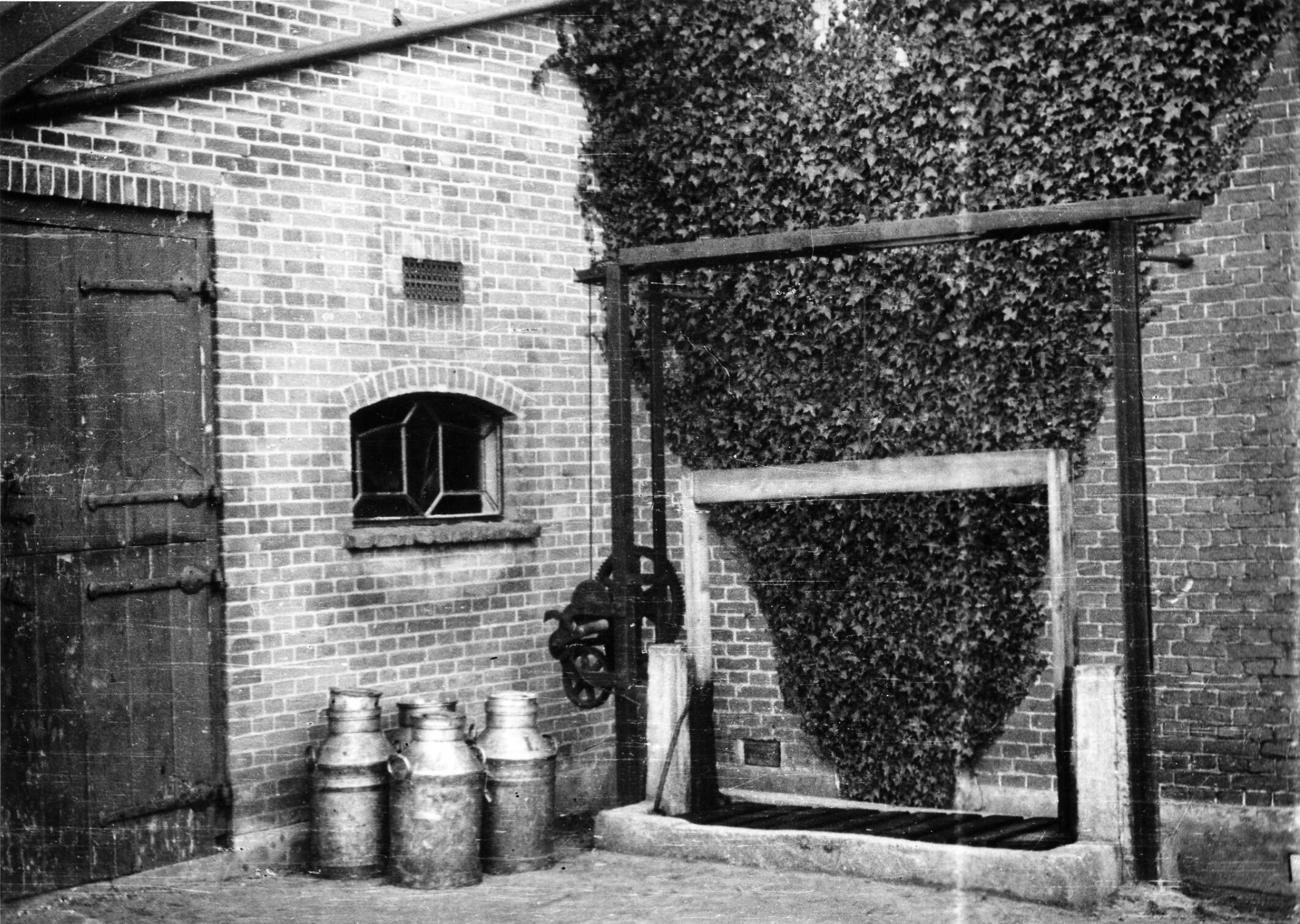 Koelbak bij een boerderij in Zuidland. De melkbussen kunnen op een rooster worden geplaatst, waarna het rooster in de koelbak met koelwater neergelaten wordt. Links staan vier melkbussen.
