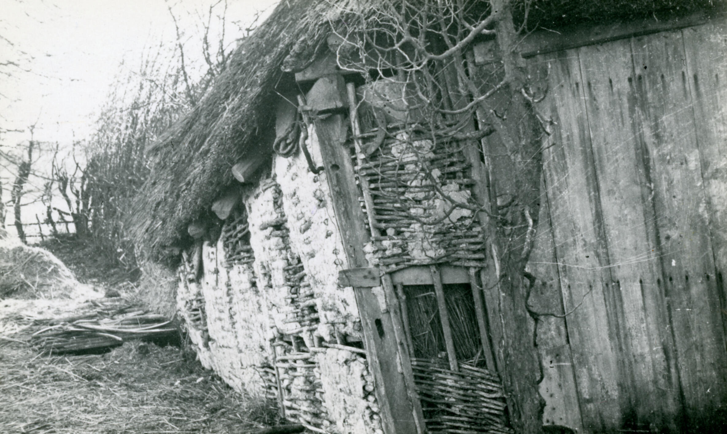 Een wand van een schuur bij een boerderij in Borkel, bij Valkenswaard. De wand bestaat uit twijgen, bestreken met leem.