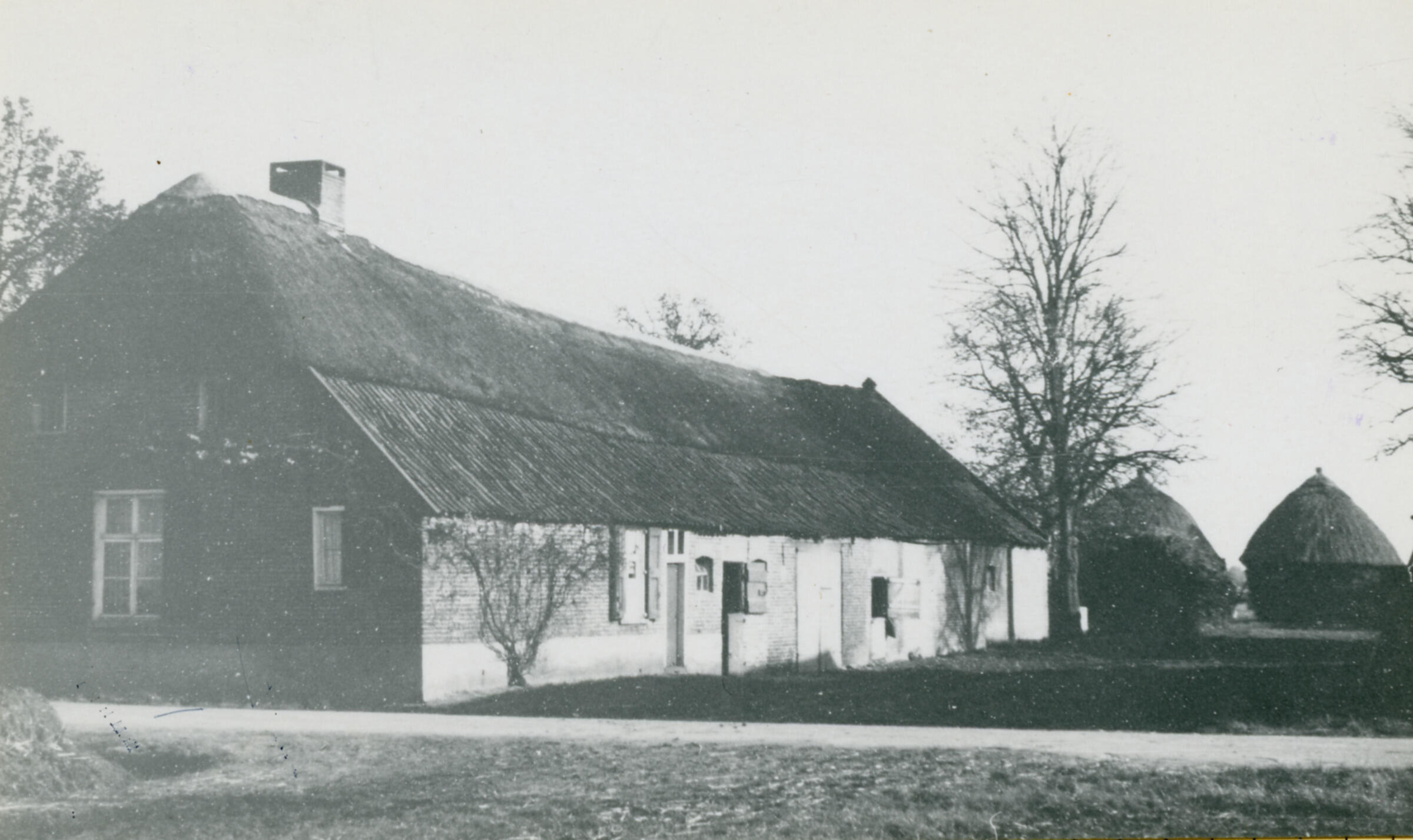 Een boerderij in Borkel. Rechts staan twee graanmijten.
