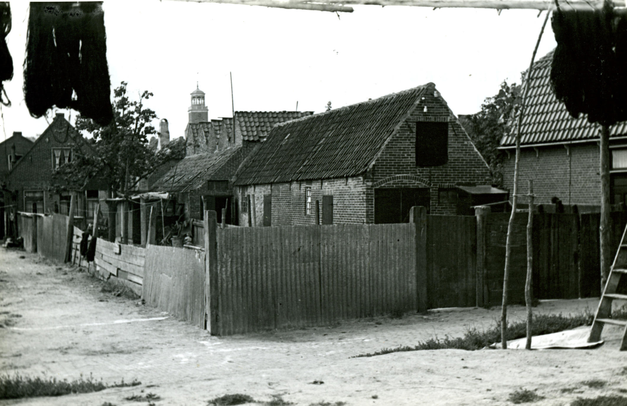 Visrokerij aan het Kalverenbos in Vollenhove. Rechts onder de torenspits zijn vijf spitse gevels te zien. Dit zijn de vishangen waarin de gevangen vis gerookt werd.