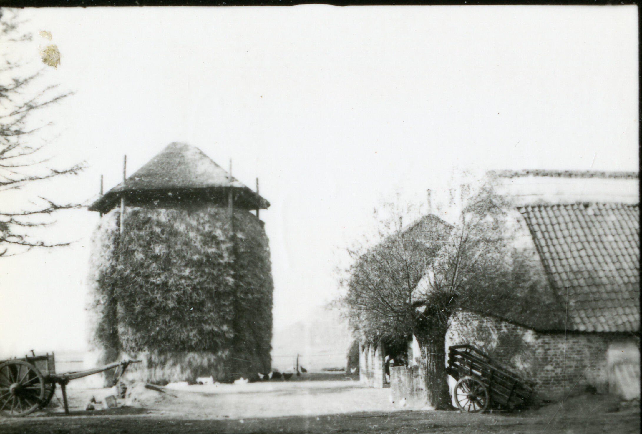 Een hooiberg en een schaapskooi bij een boerderij in De Kraats, een buurtschap bij Bennekom. Op het erf staan twee karren.