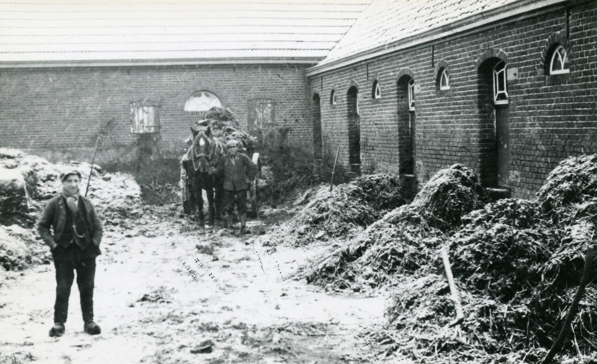 Een kar met mest tussen mesthopen, bij een boerderij in Gendringen. Voor de kar is een paard ingespannen.