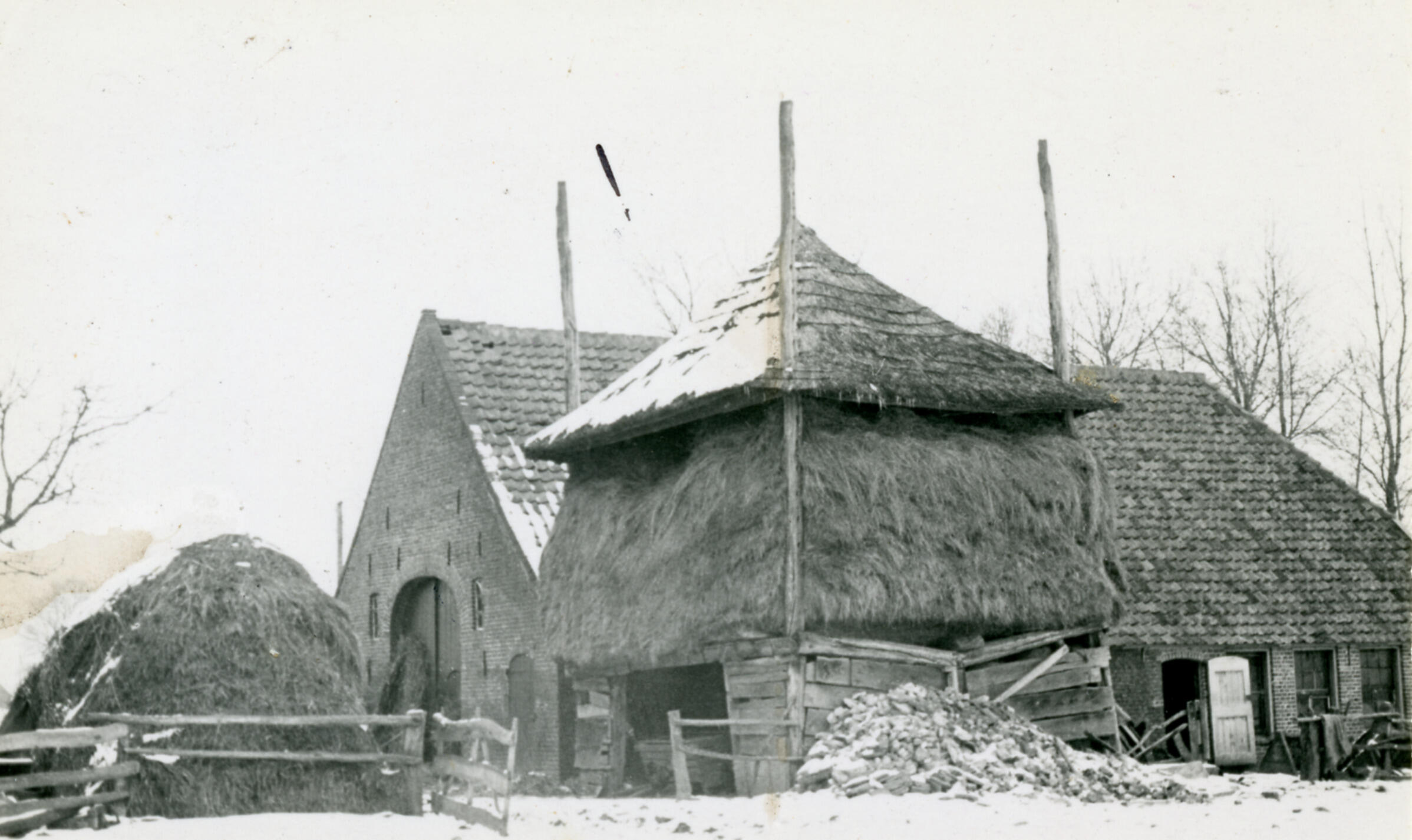 Schuur en hooiberg, Loenen (Veluwe), 1934 (zwart-wit foto)