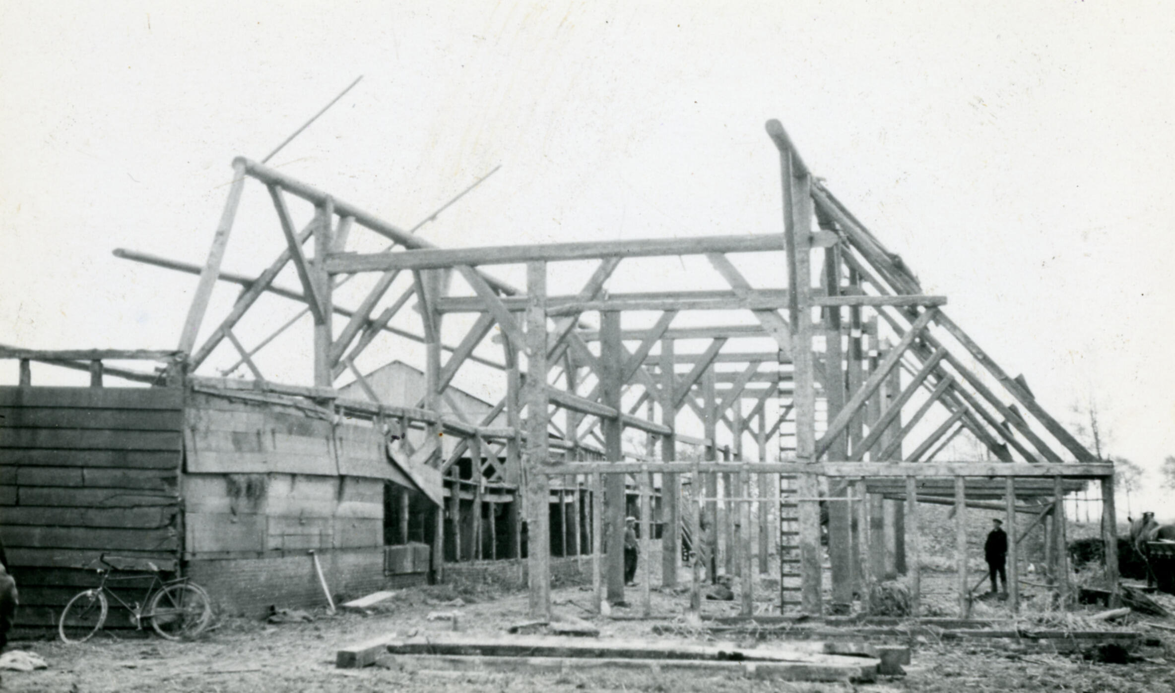 Gebintconstructie van een schuur, Zaamslag, 1934 (zwart-wit foto)