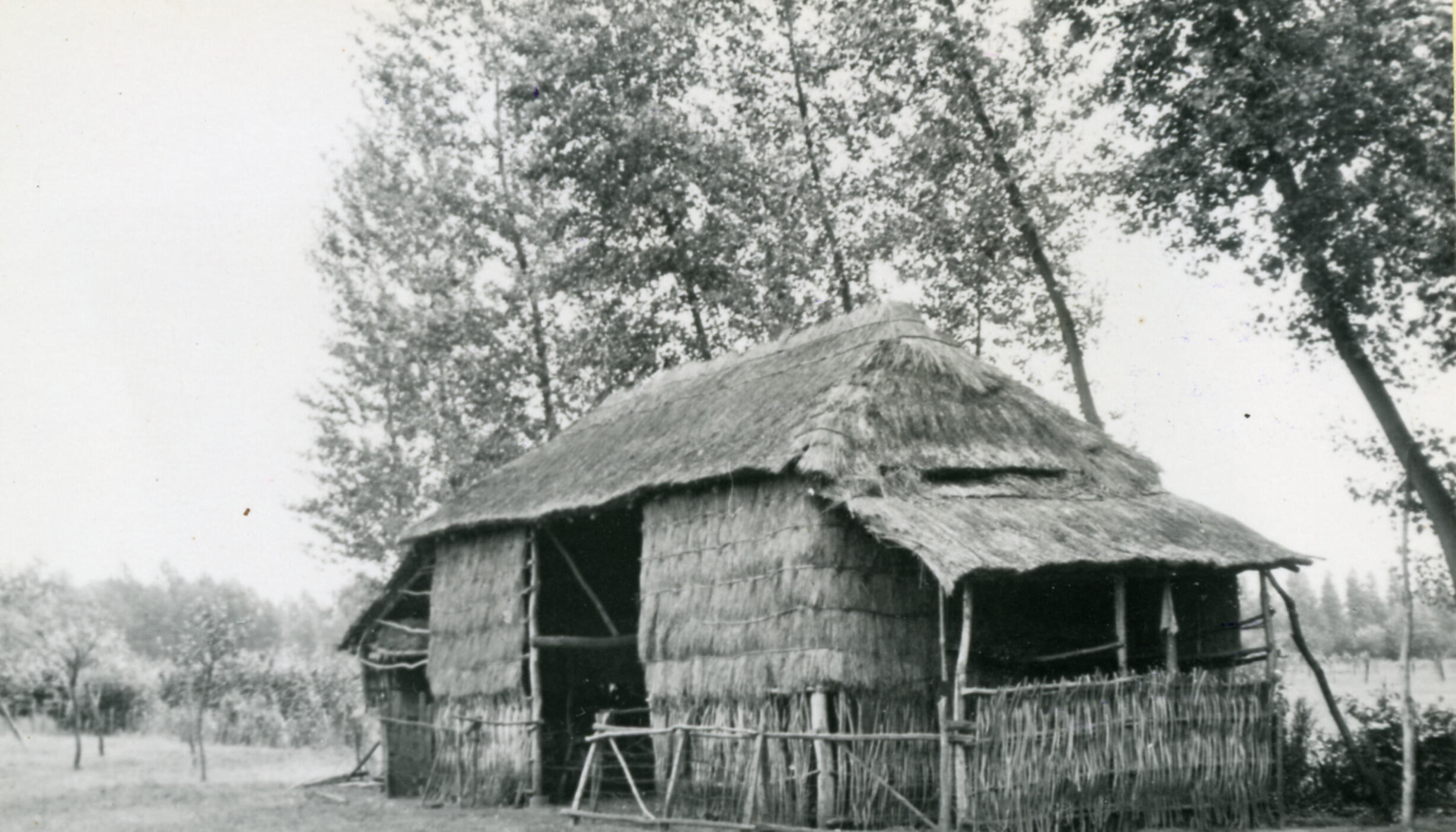 Een schuur bij een boerderij in Keldonk. De wanden zijn deels van stro.