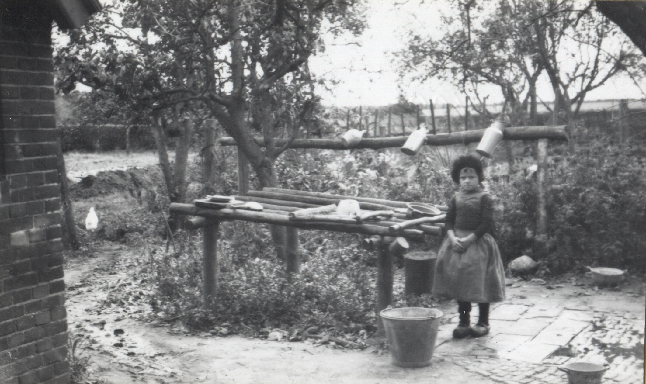 Wijmpje Smienk in Hierdense streekdracht, gefotografeerd op de spoelplaats van een boerderij in Hierden. Links van haar staat een emmerrek.