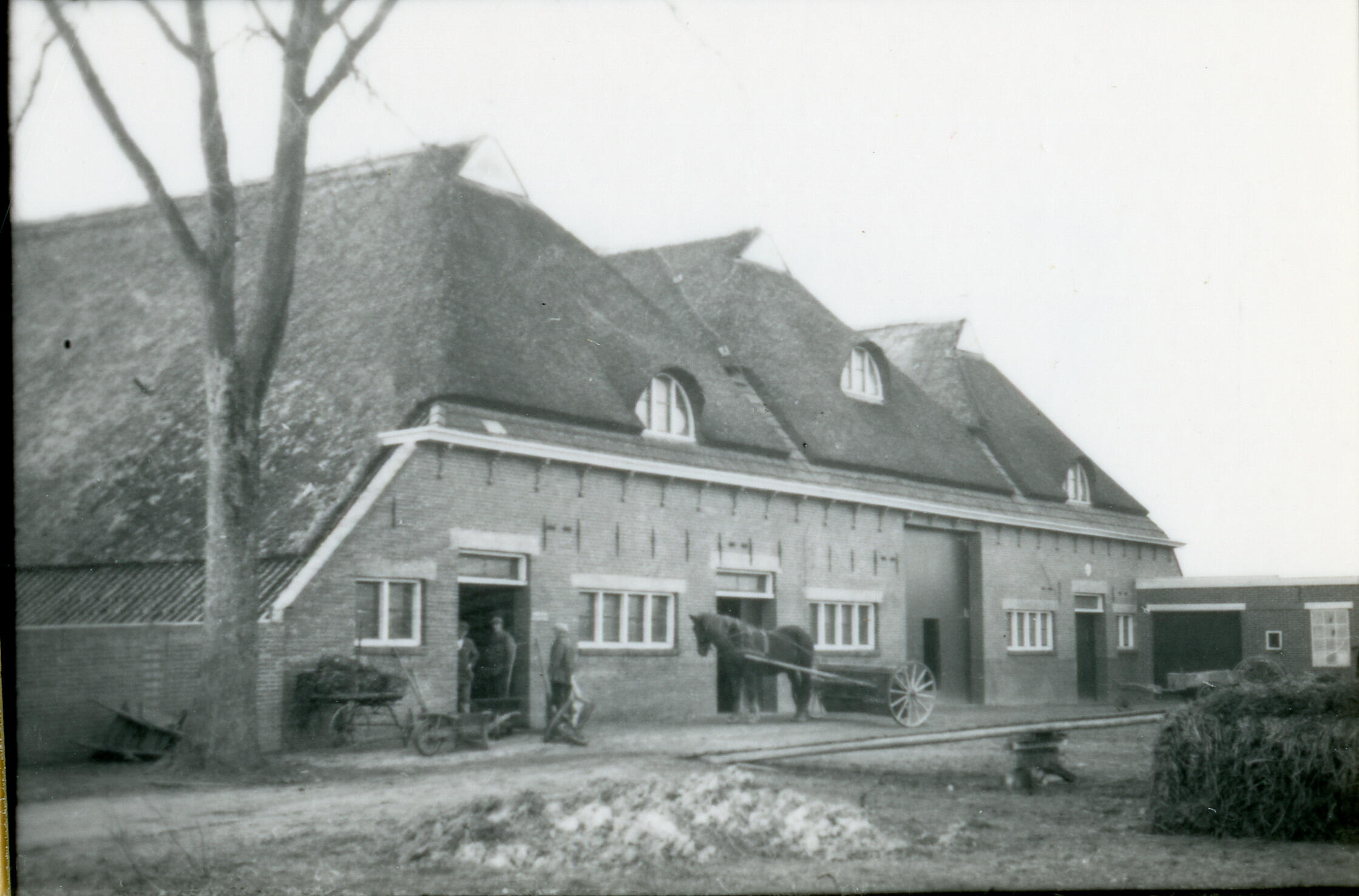 Achterzijde van een boerderij met een driekapsschuur in Zuurdijk. Achter de boerderij staat een paard voor een zaaimachine.